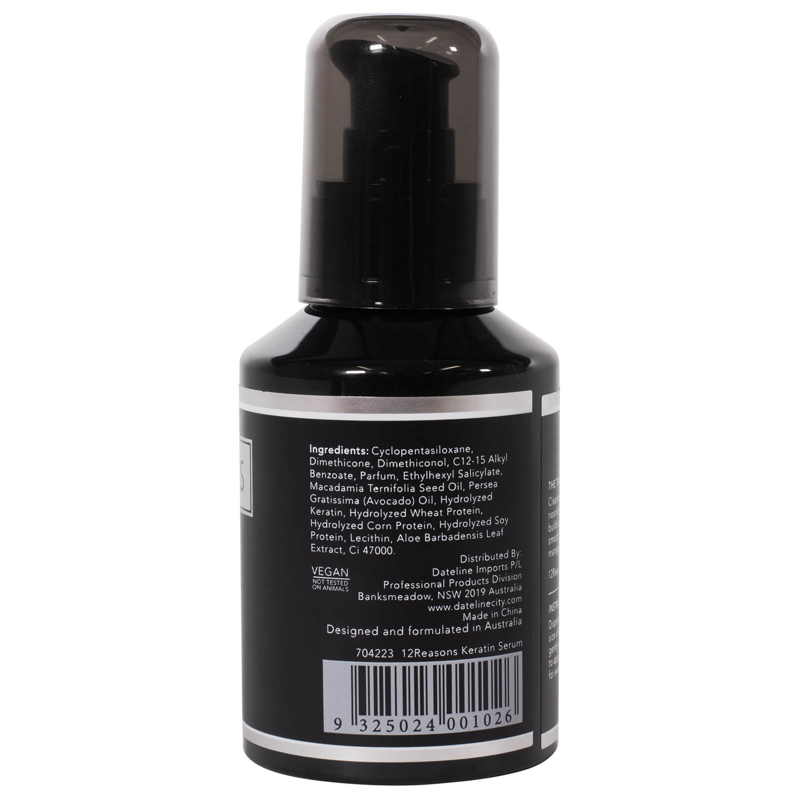 12 Reasons Keratin Hair Serum smooths and adds shine to damaged and over processed hair to help prevent frizz. Formulated with Hydrolysed Keratin which is rich in Amino Acids to protect and fortify damaged hair. Macadamia Oil brings softness and shine back to dull and damaged hair. Hair is given gorgeous shine in no time! Experience the transformational ability of 12 Reasons. Cleanse, detangle, colour protection, rich nourishment, anti-frizz, eliminate product build up, deeply moisturise, add brilliant shine, smooth, nurture dry and damaged hair, improve manageability and won't weigh hair down. 12 Reasons for exquisite hair!