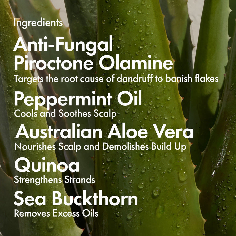 Aloe Barbadensis (Aloe Vera) Leaf Juice*, Sodium Methyl Cocoyl Taurate, Cocamidopropyl Betaine, Decyl Glucoside, Coco-Glucoside, Glyceryl Oleate, Propanediol, Piroctone Olamine, Mentha Piperita (Peppermint) Leaf Oil*, Hydrolyzed Quinoa, Polyquaternium-10, Potassium Sorbate, Olea Europaea (Olive) Fruit Oil*, Hippophae Rhamnoides (Sea Buckthorn) Fruit Oil*, Hydrolyzed Jojoba Esters, Linum Usitatissmum (Linseed) Seed Oil*, Squalane, Helianthus Annuus (Sunflower) Seed Oil*, Hibiscus Sabdariffa Flower Extract (Roselle), Camellia Sinensis (Green Tea) Extract, Brazil Nut (Bertholletia Excelsa) Seed Oil*, Queensland Nut (Macadamia Ternifolia) Seed Oil*, Rosmarinus Officinalis (Rosemary) Leaf Extract, Pentylene Glycol, Caprylyl Glycol, Ethylhexyglycerin, Citric Acid. *Certified Organic Ingredients