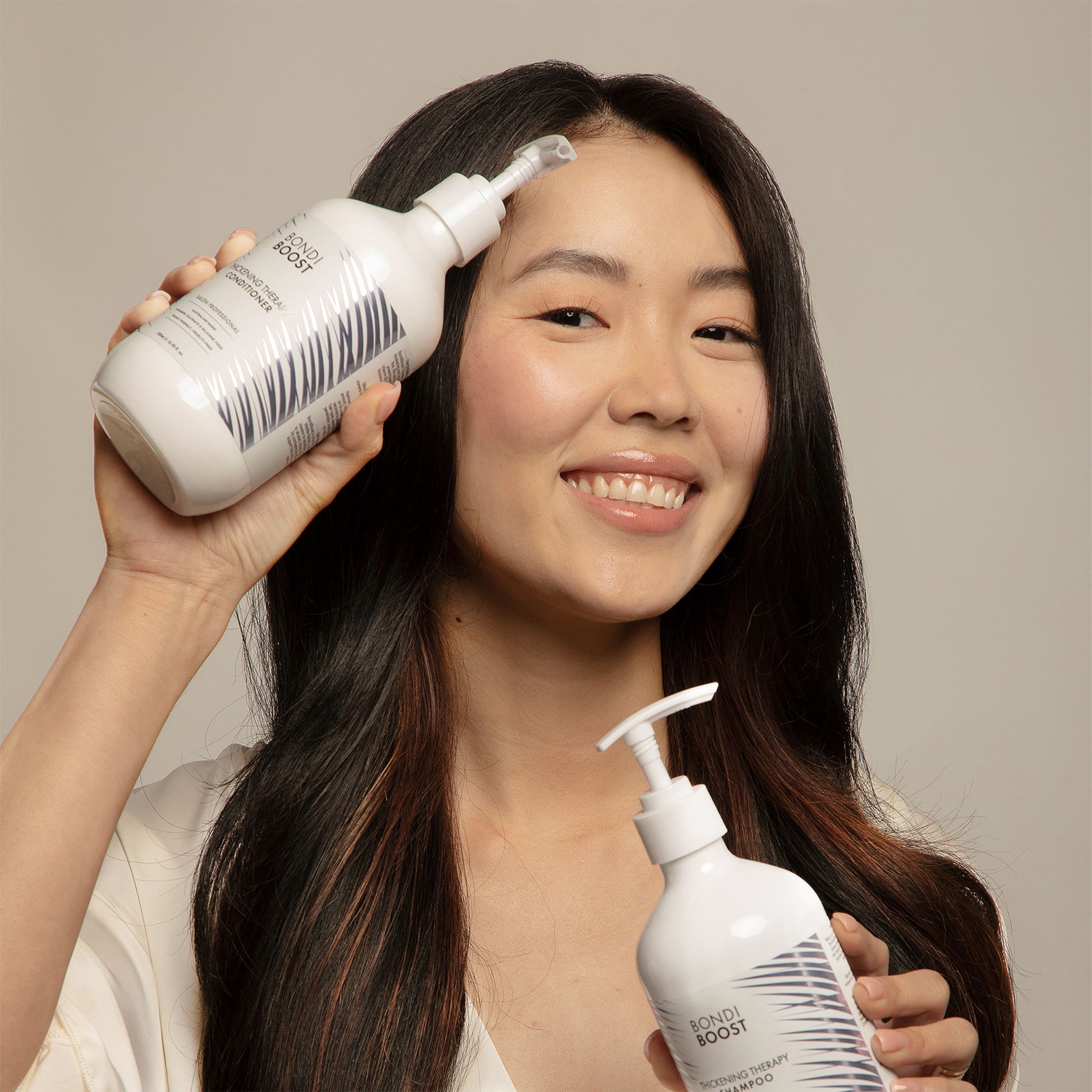 Bondi Boost Thickening Therapy Conditioner plumps and thickens the appearance of individual strands for a full-bodied finish. Targeting fine, flat and limp hair, it’s loaded with Biotin, Vitamin B5 and Hyaluronic Acid, a densifying and volumising complex developed to plump up the hair fibers for instant visible volume and thickness.