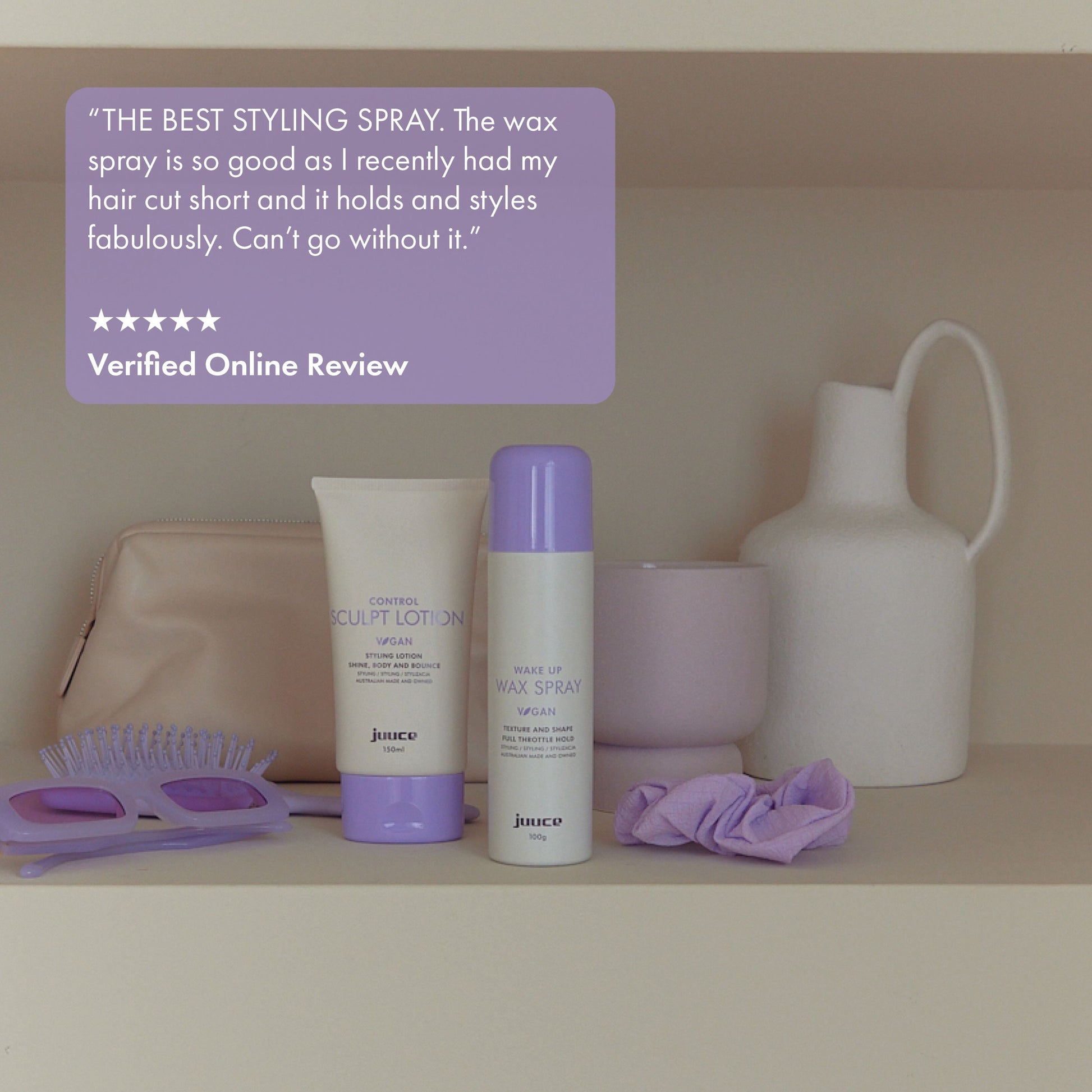 Juuce Wake Up Wax wearable wax spray adds body, texture and shape with a matt finish. Spray into undone hair for a choppy, dimensional, edgy lived in look.