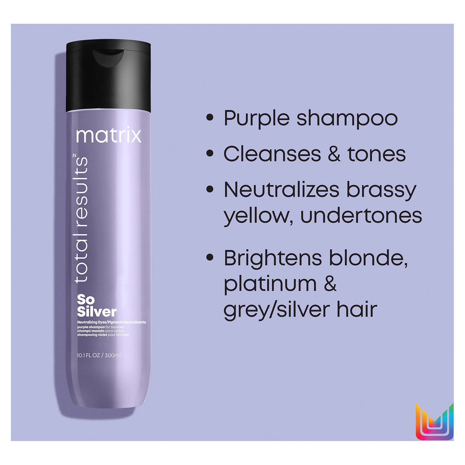 Showcase your most beautiful blonde colour with Matrix Total Results So Silver Shampoo. This professional clarifying shampoo cleanses and neutralises unwanted brassy warmth, illuminates blonde highlights, and eliminates dull, yellow tones. So Silver Shampoo is ideal for both colour-treated and natural hair ranging from grey to white shades; for best results, use 1-2 times a week in place of your regular shampoo.