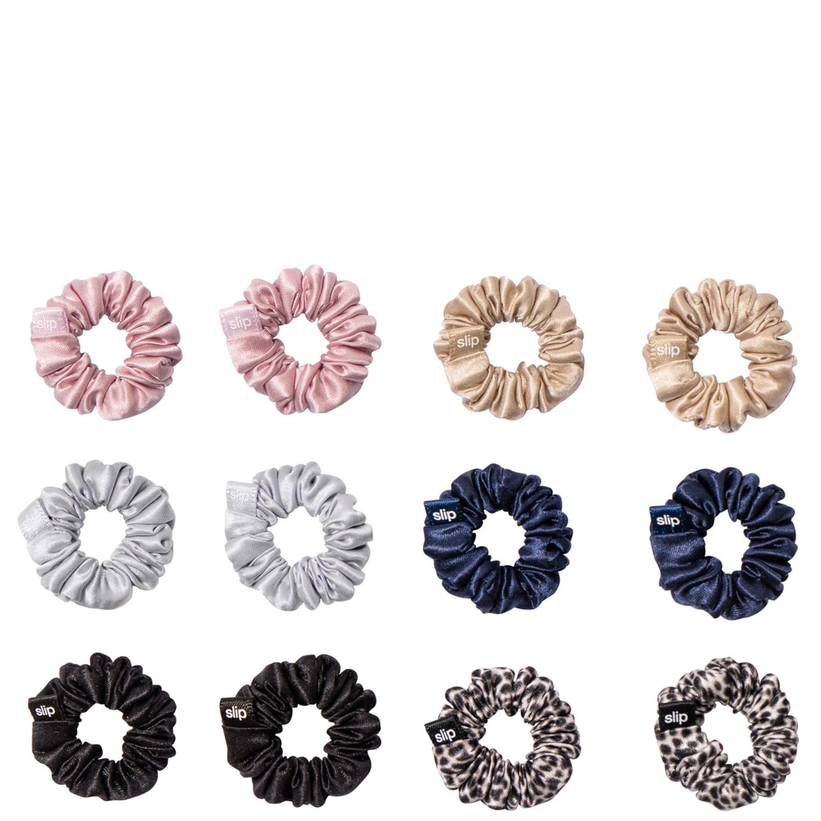 A set of 12 minnie scrunchies, made with slipsilkTM and designed to avoid hair creases. Traditional hair ties can tug on delicate hair which can lead to damage and breakage. SlipTM scrunchies are made with slipsilkTM, the same silk used in the award winning slipTM pure silk pillowcase. Anti Crease. Anti Breakage.