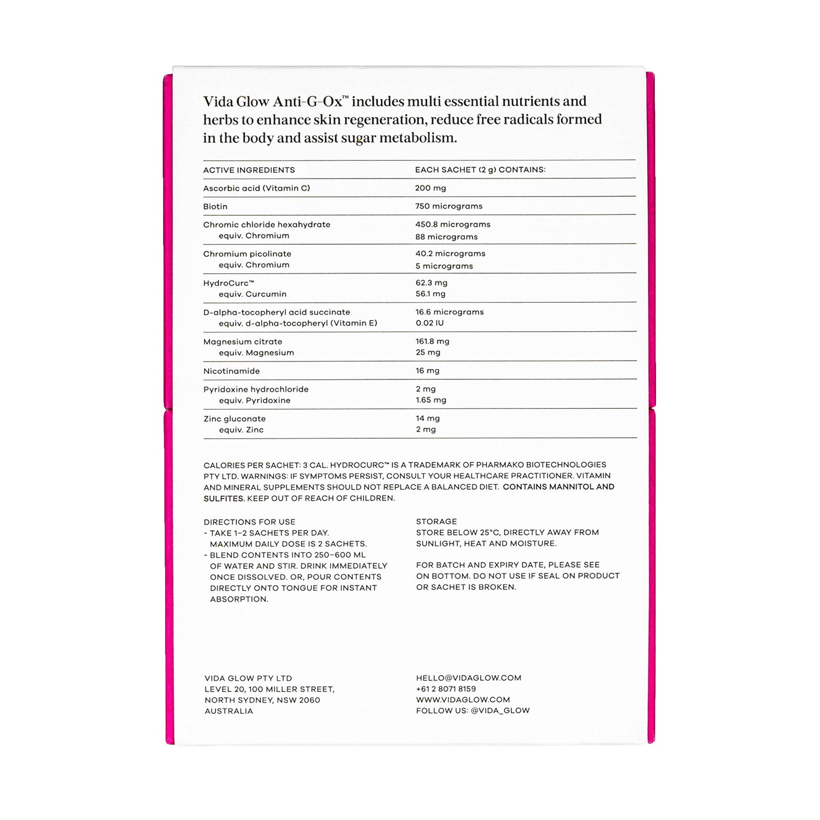 Vida Glow Anti-G-Ox contains no artificial flavours, preservatives or other additives and is Vegan friendly.
