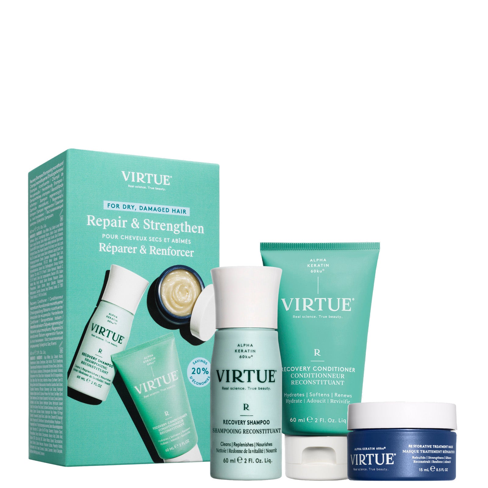 Powered by first-of-its-kind Alpha Keratin 60ku®, the VIRTUE Recovery Discovery Kit features a trio of high-performance formulas designed to nourish and visibly repair weakened strands. Infused with luxurious notes of creamy coconut and tropical yuzu extracts, the set delivers a rich, warm woody aroma.