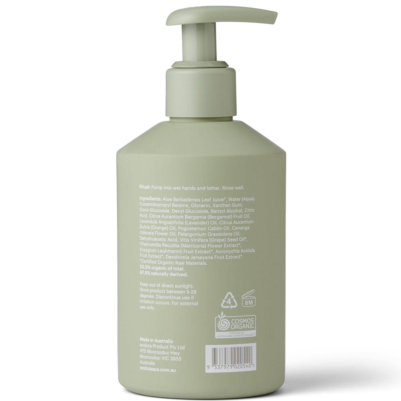 ,Certified organic. Aloe Barbadensis Leaf Juice*, Water (Aqua), Cocamidopropyl Betaine, Glycerin, Xanthan Gum, Coco-Glucoside, Decyl Glucoside, Benzyl Alcohol, Citric Acid, Citrus Aurantium Bergamia (Bergamot) Fruit Oil, Lavandula Angustifolia (Lavender) Oil, Citrus Aurantium Dulcis (Orange) Oil, Pogostemon Cablin Oil, Cananga Odorata Flower Oil, Pelargonium Graveolens Oil, Dehydroacetic Acid, Vitis Vinifera (Grape) Seed Oil*, Chamomilla Recutita (Matricaria) Flower Extract*, Syzygium Leuhmannii Fruit Extract*, Acronychia Acidula Fruit Extract*, Davidsonia Jerseyana Fruit Extract*. *50.05% organic of total. 97.5% naturally derived