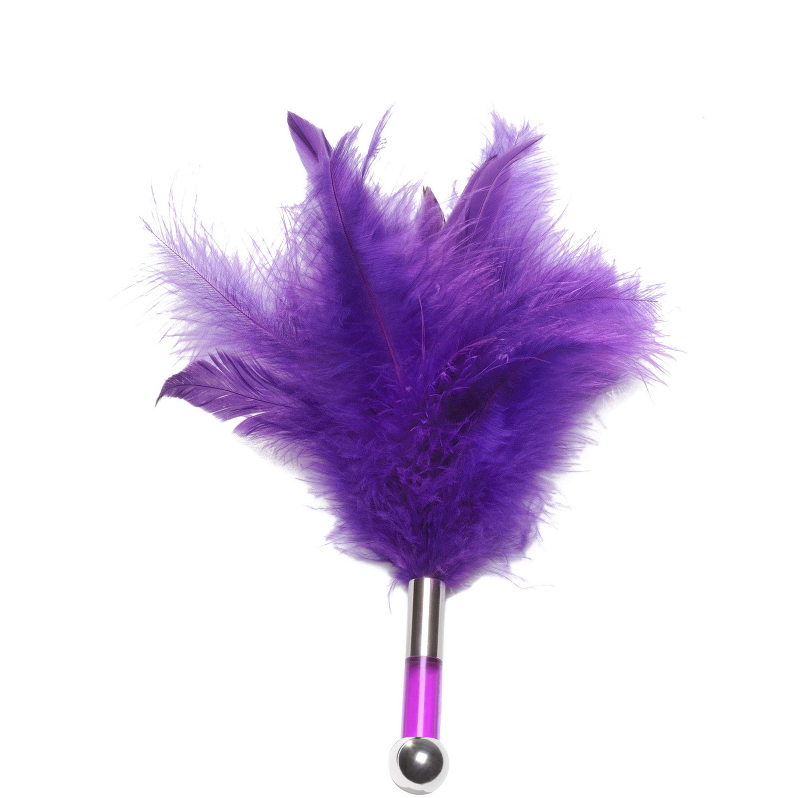 Combining luxurious down feathers with a polished metal and acrylic handle, this teaser offers a stylish invitation to your many soft, sensual, and seductive trysts ahead.