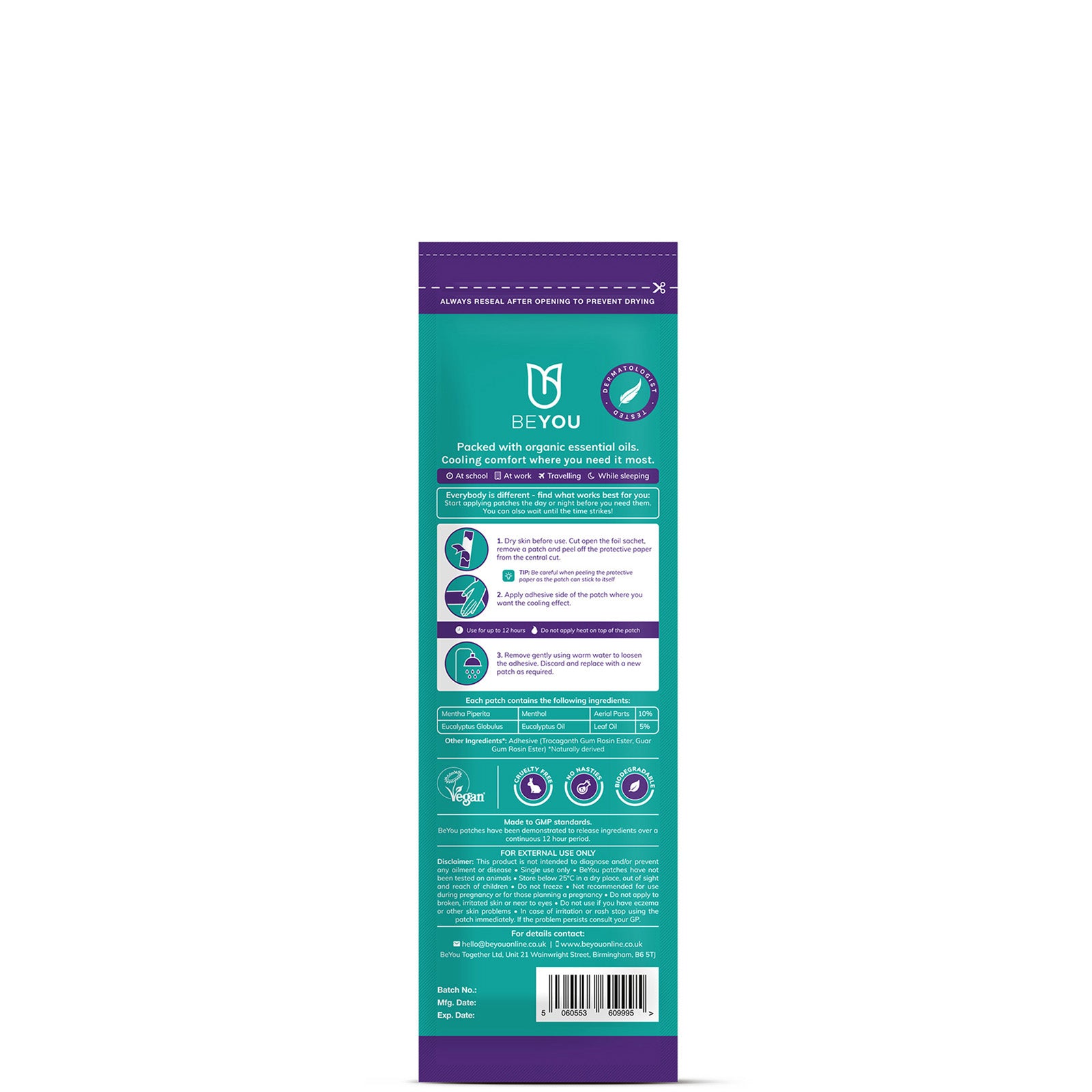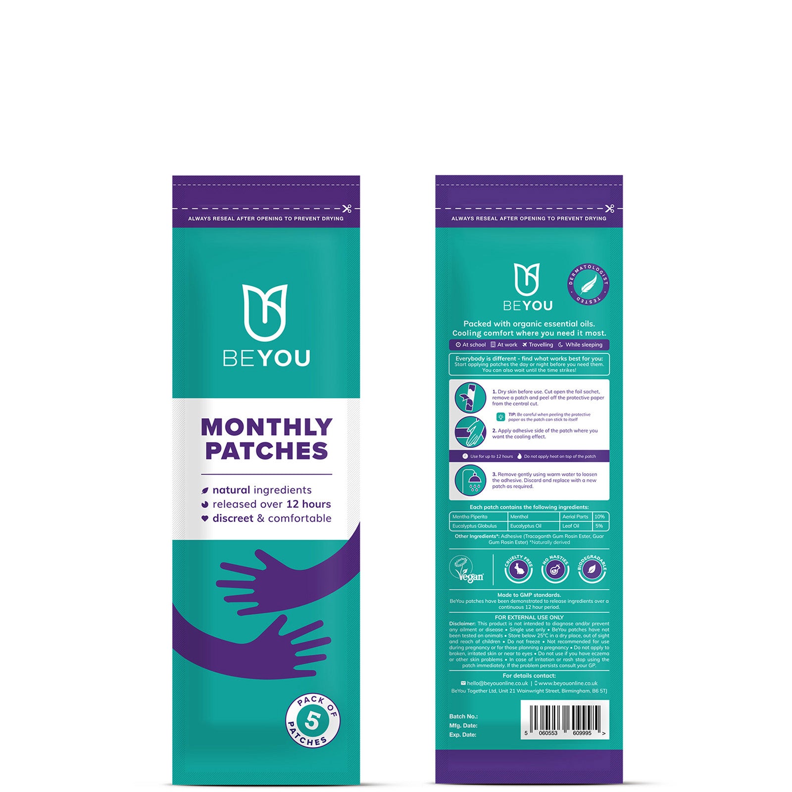 BeYou Monthly Patches are long-lasting, slow releasing and deliver cramp-numbing sensation to the skin over 12 hours. These 100% natural patches are made from steam-distilled eucalyptus and peppermint-derived menthol oils which create a unique cooling tingle. What's more, they're incredibly thin and discreet so you can say goodbye to bulky hot water bottles. Simply apply the patch to the area of concern, during the day or night, then get dressed and carry on as normal!