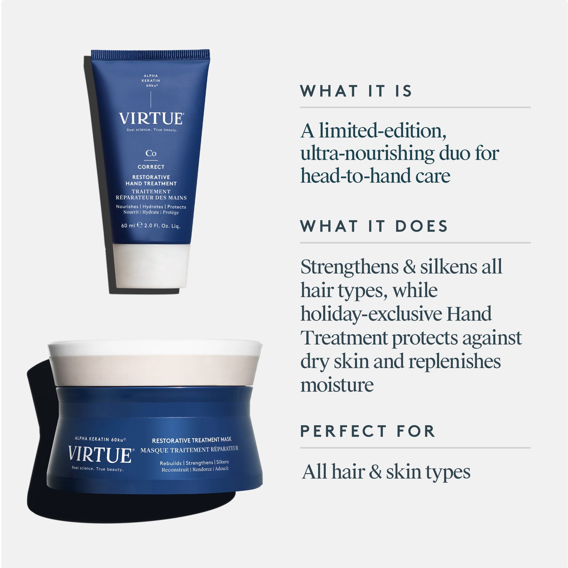 Rehabilitate and restore with this limited-edition, ultra-nourishing set for head-to-hand care. Infused with Alpha Keratin 60ku®—Virtue’s patented protein, bio-identical to the keratin naturally found in your hair and skin—these powerful formulas work to rejuvenate, repair, and revitalise from root to fingertip.