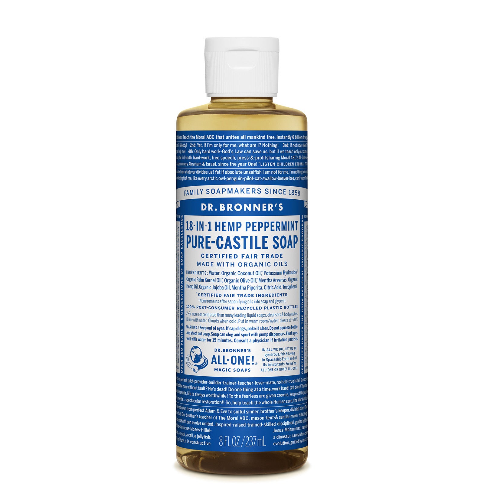 Dr. Bronners 18-in-1 Pure-Castile Soaps are good for just about any cleaning task. Face, body, hair; food, dishes, laundry, mopping, pets-clean your house and body with no synthetic preservatives, detergents or foaming agents-none! Dilute! Dilute! .