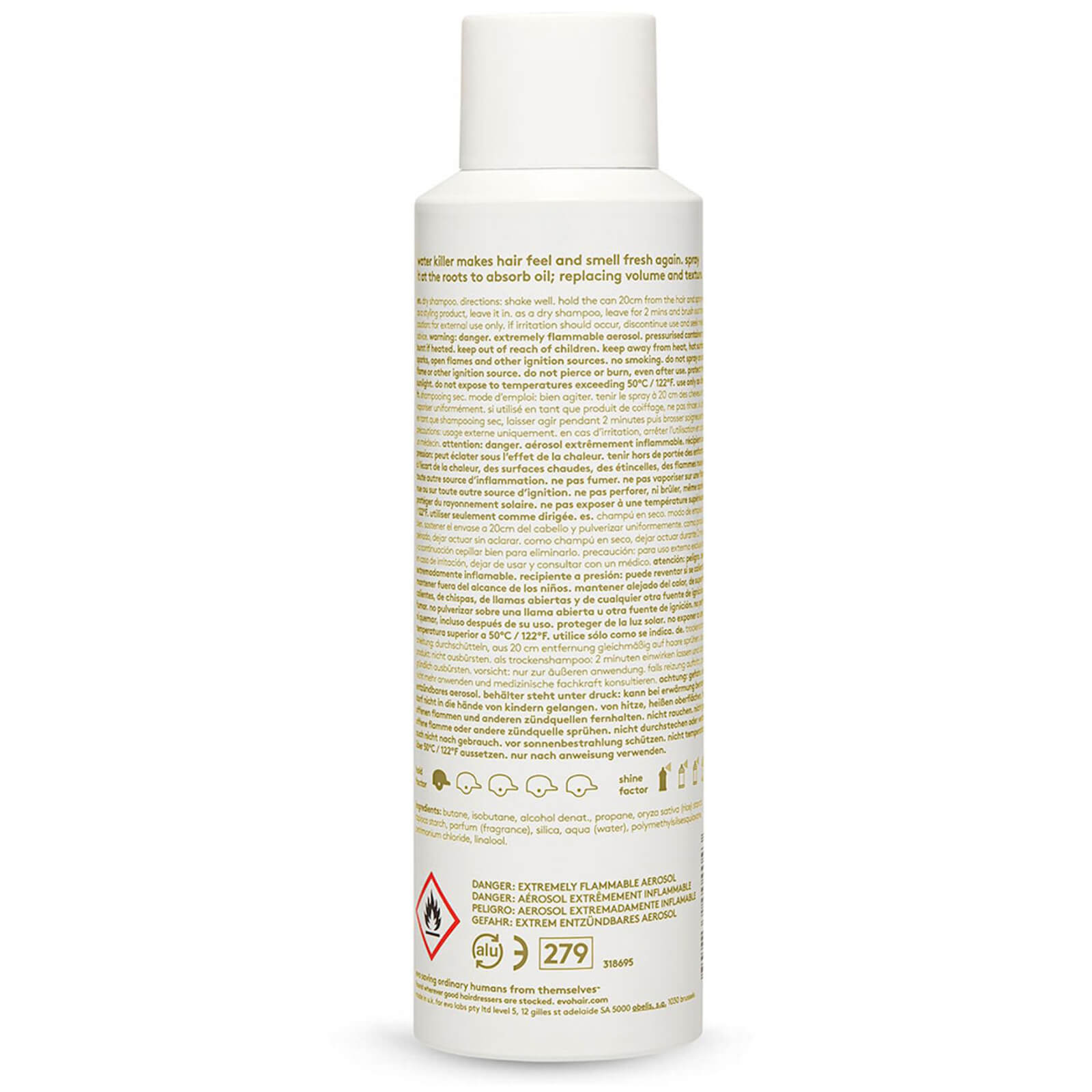 Evo water killer dry shampoo helps prevent damage to hair through washing and blow drying. Saves times. Saves water. Can be used anytime, anwhere. Can also be used as a texturising styling spray. Makes hair feel and smell fresh again. Recommended for all hair types.