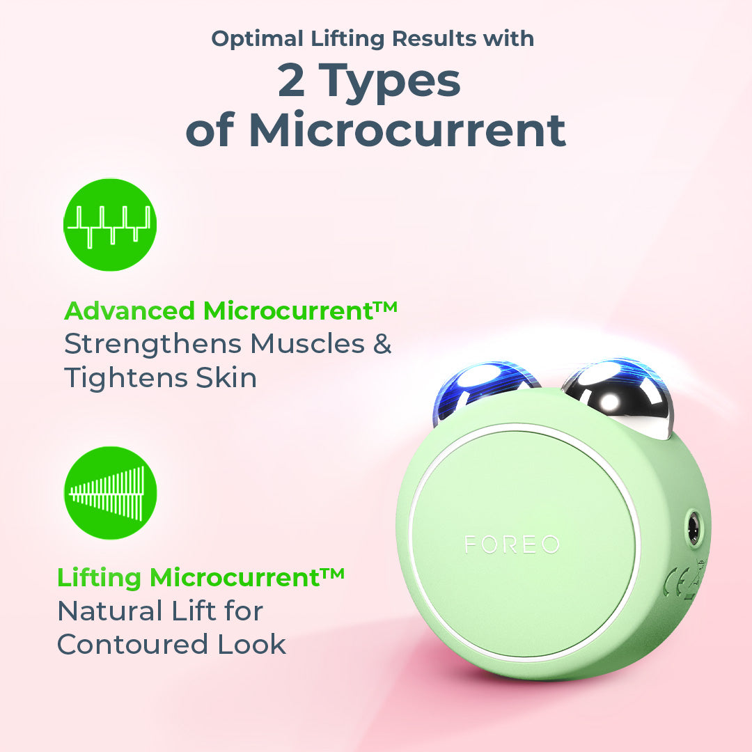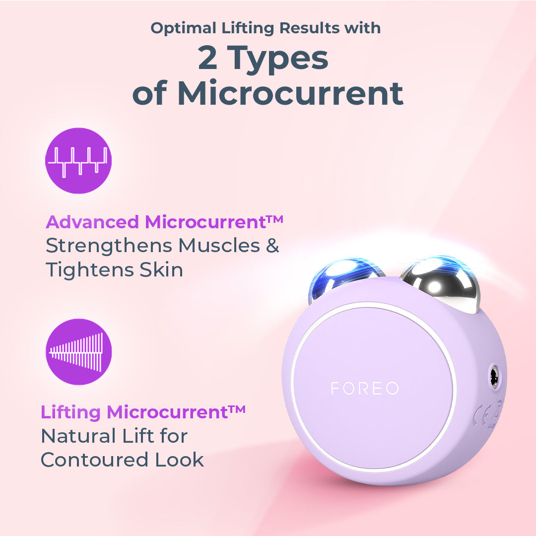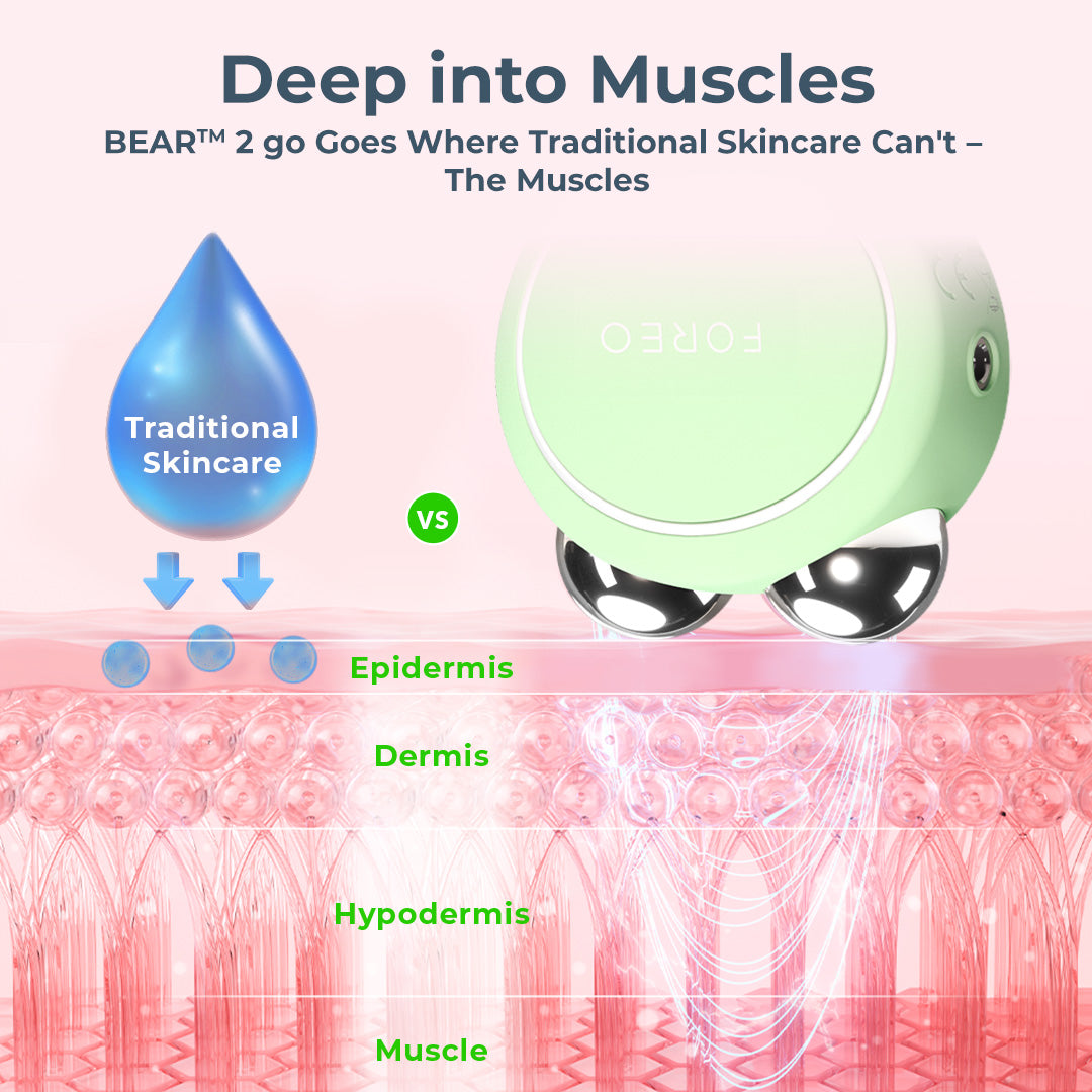 HOW TO USE: • Download the FOREO For You app. Activate Bluetooth and sync device with the app. • Cleanse your face with an oil-free cleanser, removing makeup, oils, and impurities. • Apply a thin layer of FOREO’s conductive serum for a safe and effective treatment. • Select your pre-set routine and microcurrent intensity via the app or manually with the universal button. • Glide BEAR™ 2 go across your skin desired areas. The device will switch off once the routine is complete. • Continue with your regular skincare routine. • Use for 2 minutes once a day, at any time of the day or night.
