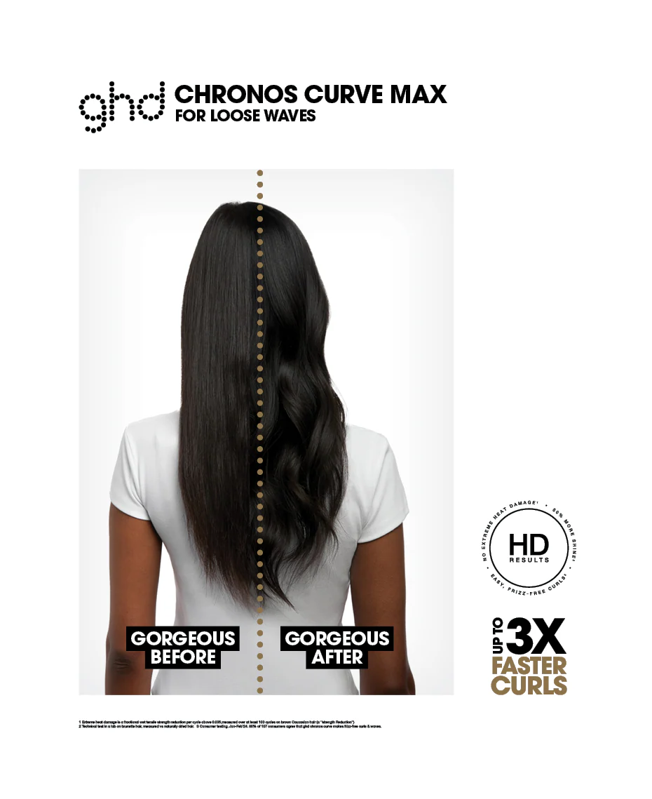 New GHD Chronos Curve, a new range of curlers with Curl-Responsive Technology for ultimate control of 185∞C across the barrel. Introducing, GHD Chronos Curve Max Wand: bigger barrel for faster, high-definition results that last all day.