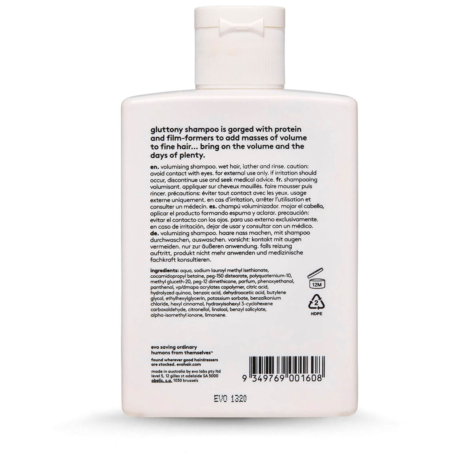 Give your hair the volume it craves with Evo Gluttony Shampoo. This volumising formula builds serious body, allowing you to enjoy big, beautiful hair that will look amazing in a number of different styles. Free from sulphates, this low-foam shampoo is a better choice for the environment and will also last longer than many other shampoos.