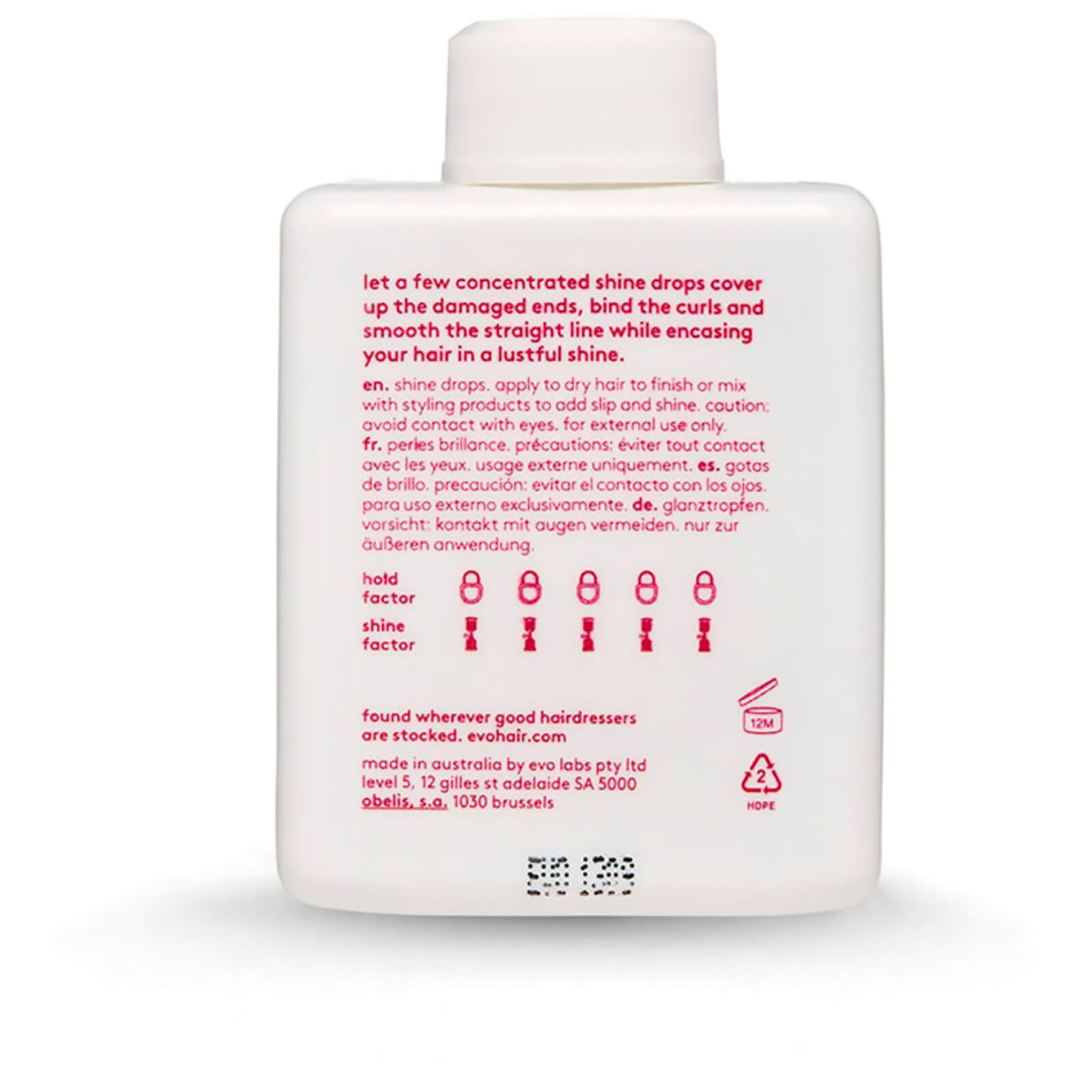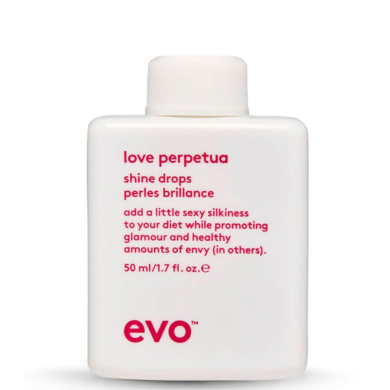 Evo love perpetua shine drops reduces frizz and flyaways. Hides split ends. Can be mixed easily with all products to boost condition and shine. Increases combability. Adds incredible shine. Recommened for thick coarse hair.