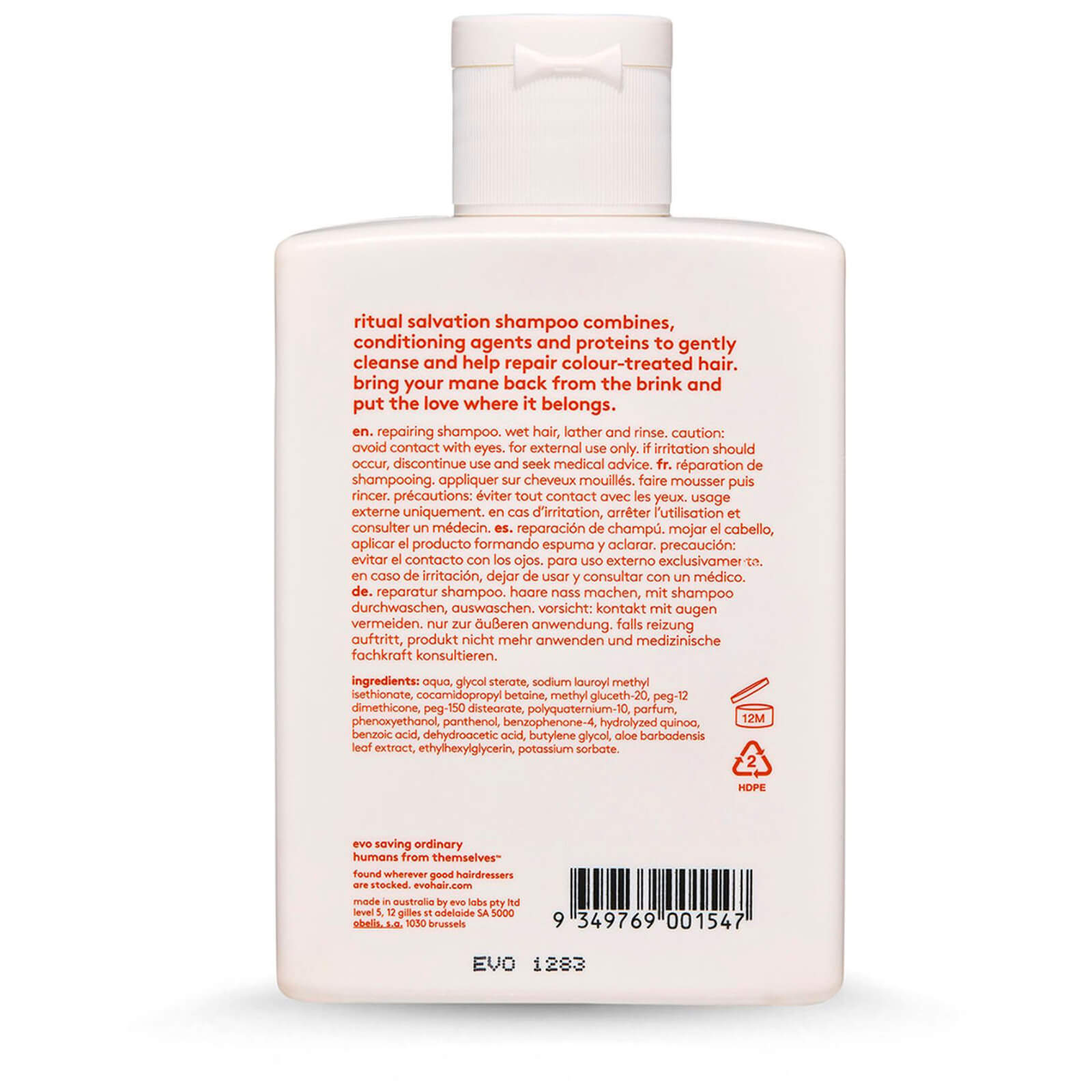 Evo ritual salvation care shampoo helps to strengthen hair and prevent fading of colour. Sulphate free cleansers have low faming action to clean gently and are better for the planet. Recommended for colour-treated, weak, brittle hair.