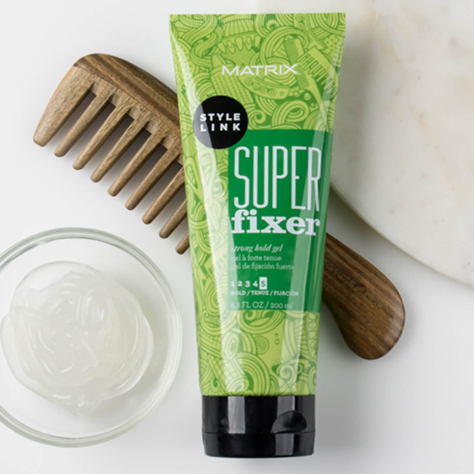 Super Fixer Strong Hold Gel from the Matrix Style Link range is a lightweight gel that works effectively with thick and fine hair. Create any style you desire with strong hold control and enhanced shine, without making hair too stiff or leaving behind flakes and residue. Suitable for use on damp or dry hair, the gel is clean to apply and easily washes out with water.