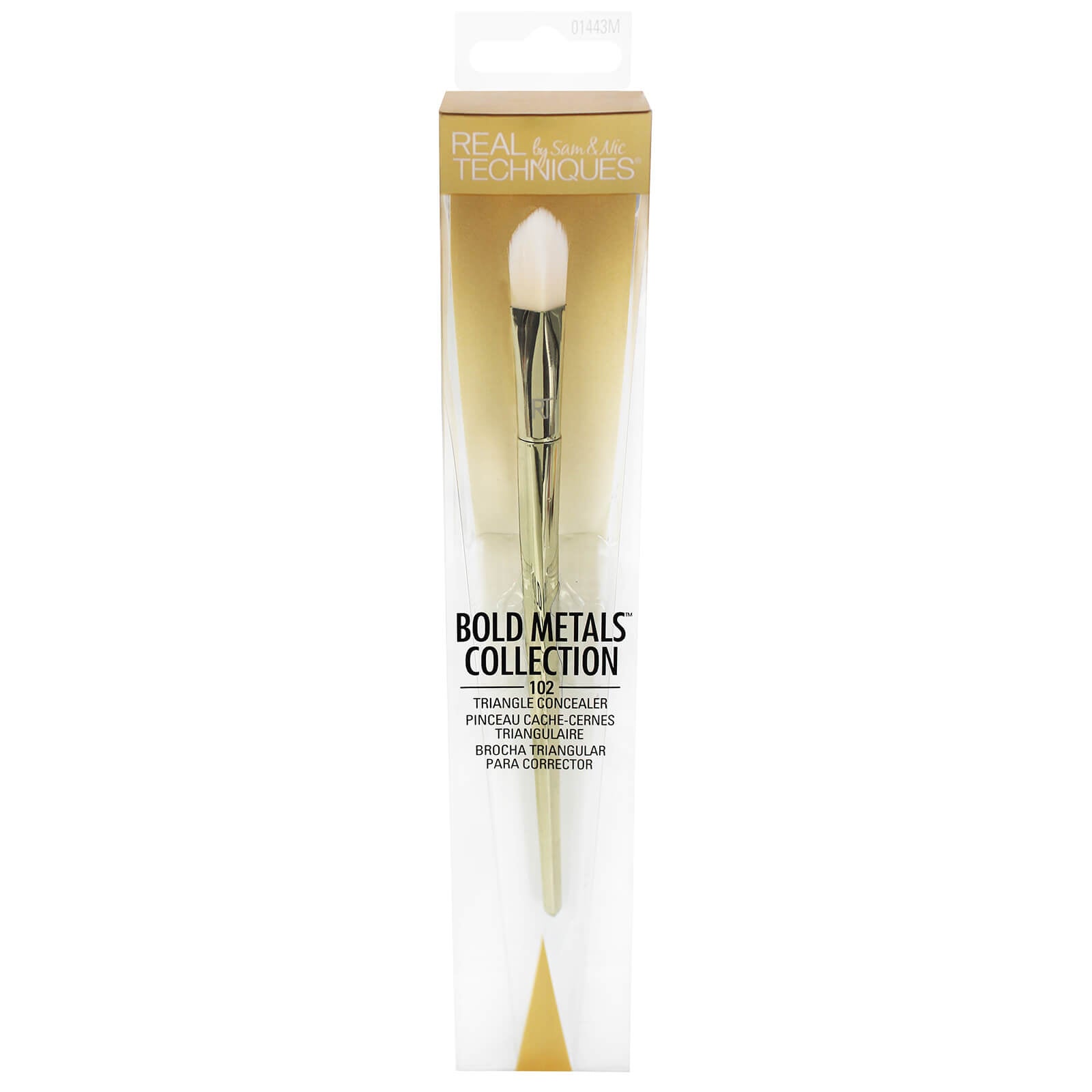 Perfect your complexion with the Bold Metals Triangle Concealer Brush from Real Techniques. Featuring a weighted brass ferrule, its flat edge covers large areas of the face, whilst the angled edges contour and highlight areas around the eyes, nose and chin. Its UltraPlush™ synthetic taklon bristles effortlessly distribute cream, liquid and powder products to expertly cover imperfections, leaving you with a flawless make-up base.
