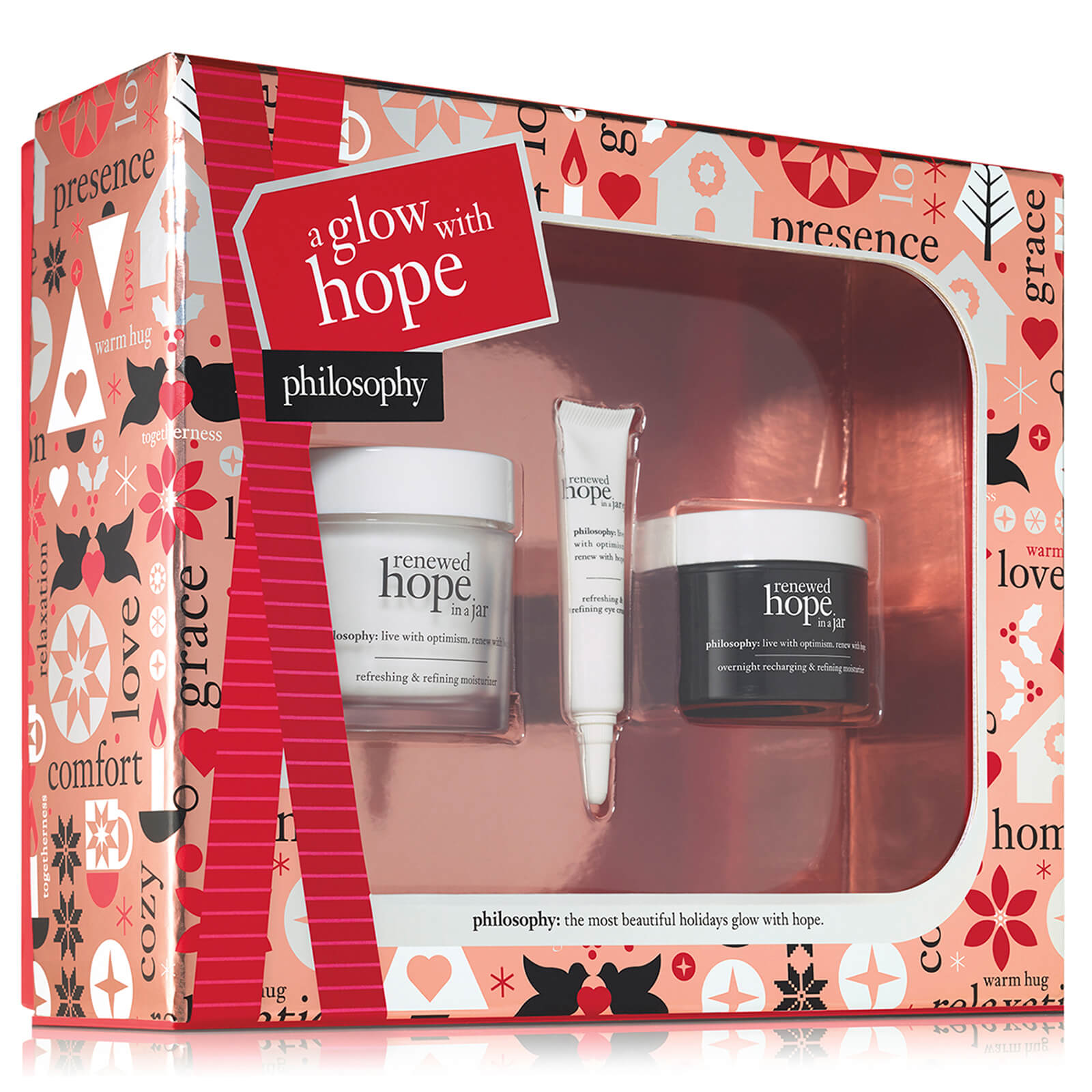 Achieve 24-hour radiance with philosophy a Glow with Hope; a trio of skincare treats that work to banish dullness and improve skin health. The moisturiser, eye cream and night treatment work in harmony to hydrate, brighten and infuse skin with youthfulness.