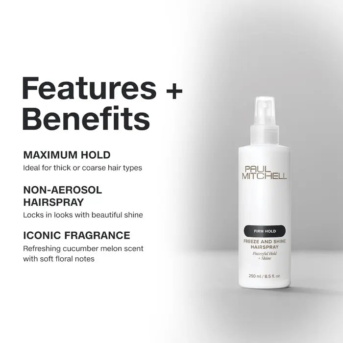 Achieve long-lasting hold and brilliant shine with Paul Mitchell Freeze & Shine Non-Aerosol Hairspray. Perfect for thick or coarse hair, this best-selling hairspray locks in any look while delivering a high-gloss finish without the stiffness or flaking of traditional sprays. Loved worldwide—1 sold every 28 seconds*—this professional hairspray is ideal for finishing styles, creating wet-look hairstyles, or adding shine and structure to any hair type.