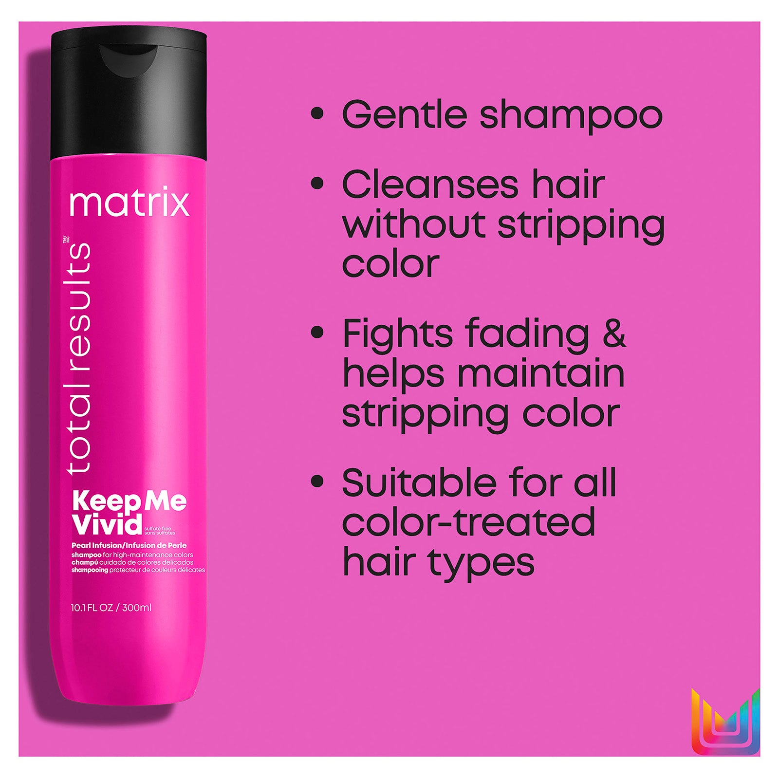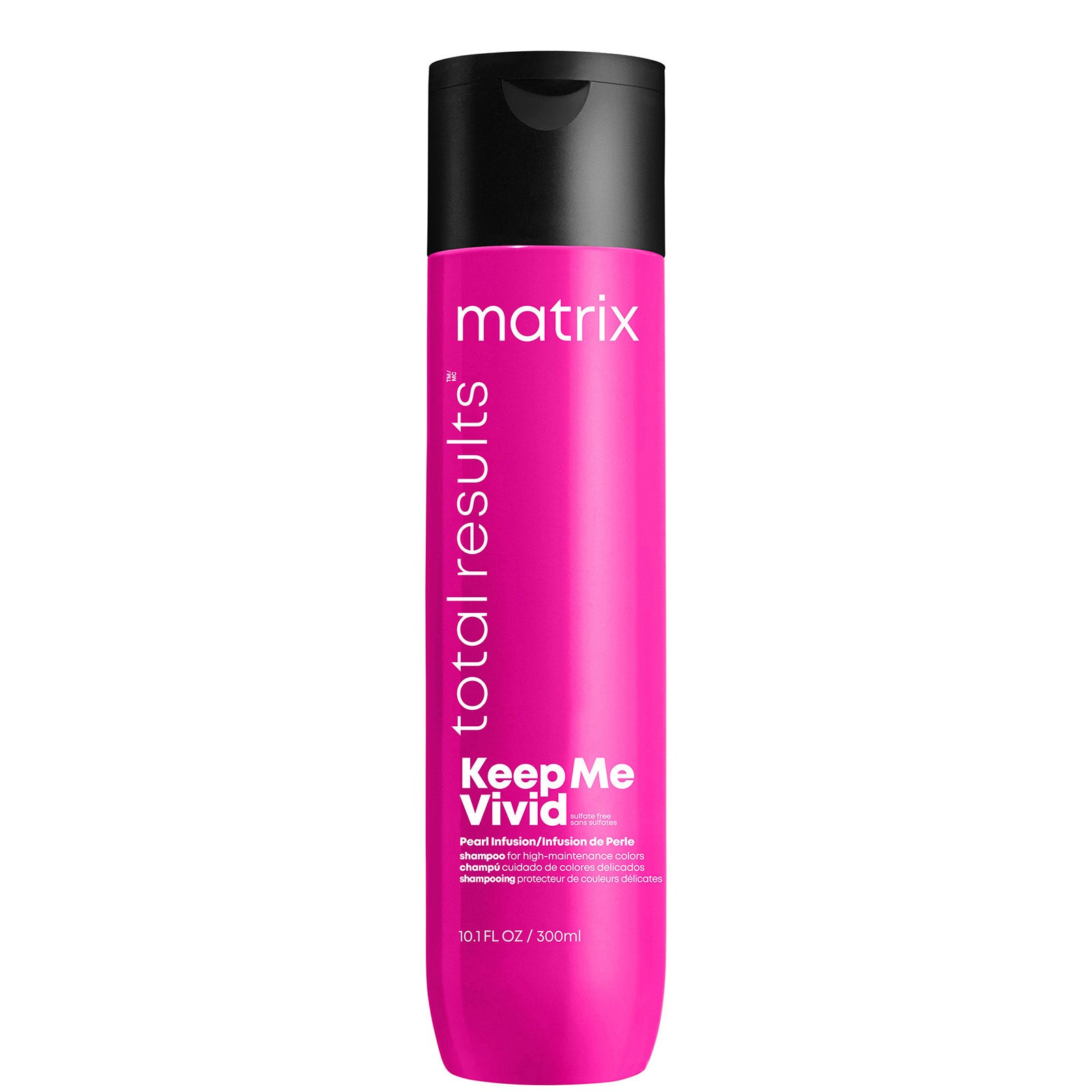 A sulfate free shampoo that keeps hair colour in & the no-no's out. Matrix Total Results Keep Me Vivid Shampoo has a milky high-foam lather that gently cleanses hair while maintaining vibrancy and preventing colour fade. Product fragrance includes notes of vanilla, coconut, and cotton candy. Using the Keep Me Vivid system, your hair colour can last for up to 21 washes and benefit from increased shine.