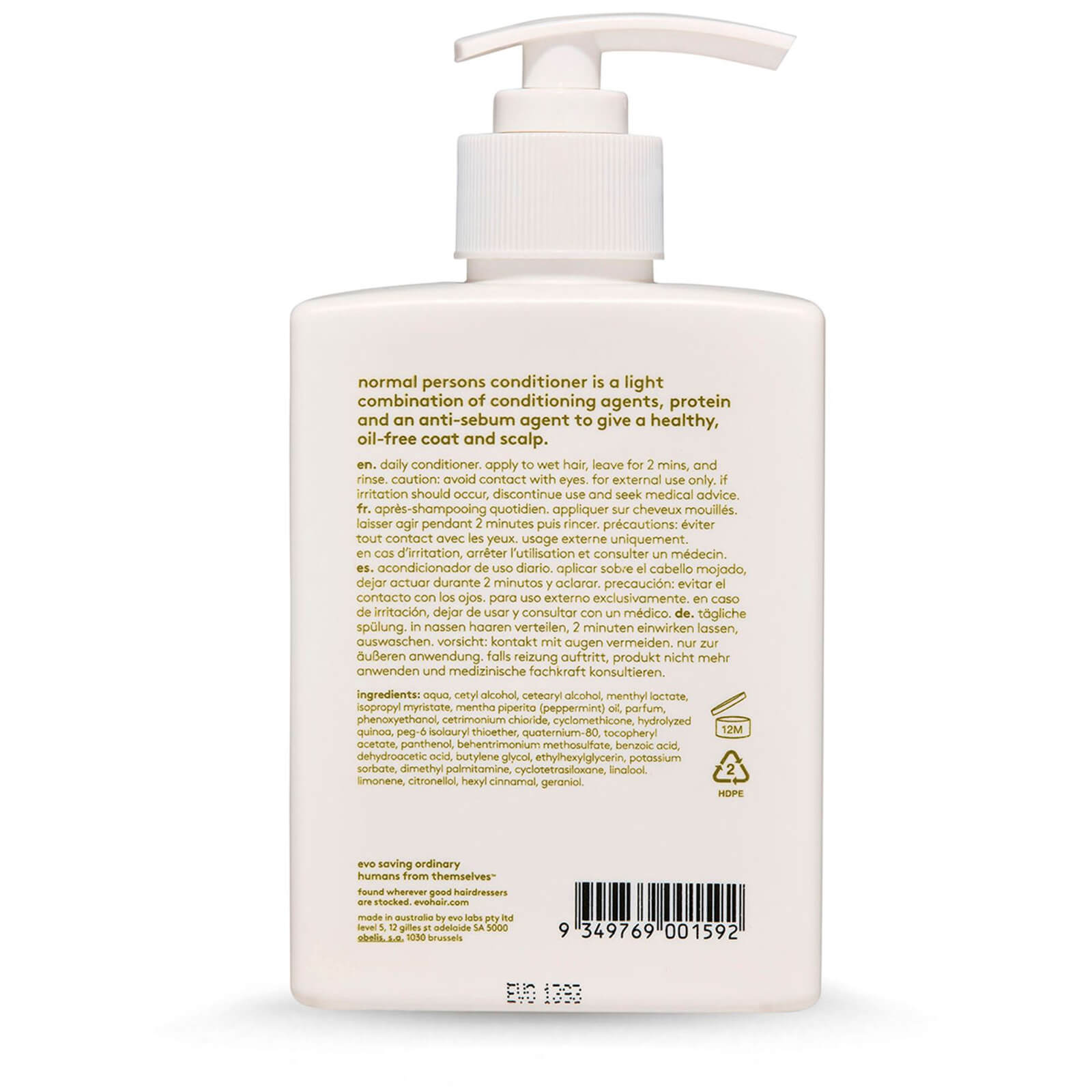Evo normal persons daily conditioner lightly conditions the hair, balances and stimulates the scalp. Cooling sensation in hot weather. Recommended for all hair types, especially normal to oily hair.