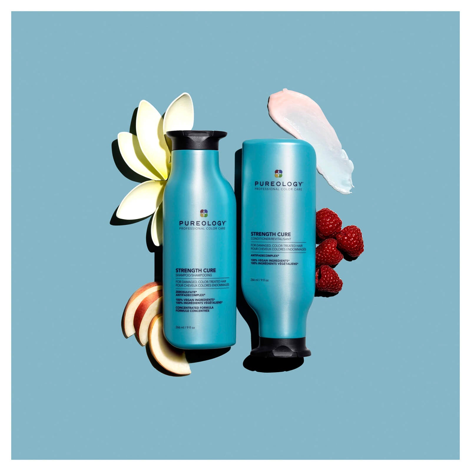 Pureology Strength Cure Conditioner fortifies and repairs damaged, colour-treated hair with key ingredients Keravis and Astaxanthin and a signature aromatherapy blend of Raspberry, Peach, and Water Flowers.
