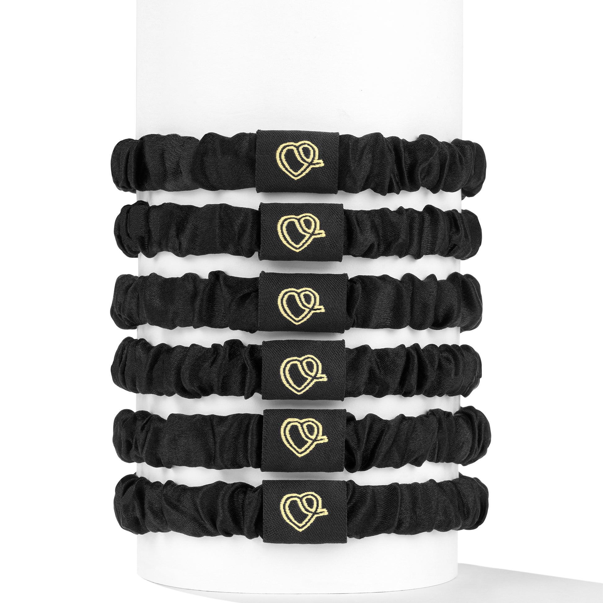 Handcrafted from 100% pure mulberry silk with a specially selected, super-strength elastic interior, the black silk hair ties glide over hair to prevent snagging and tugging, and provide super strong hold with causing damage, split ends or unsightly kinks.
