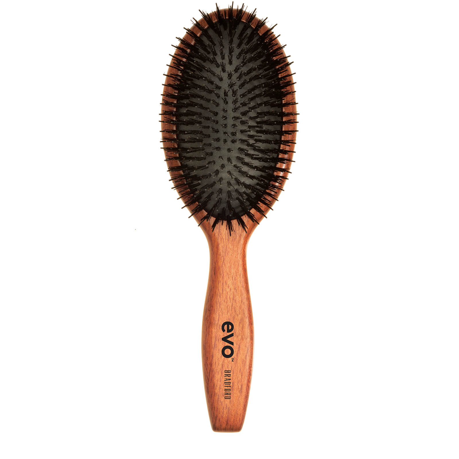 The Bradford Dressing Brush from Evo is a versatile hairbrush that makes detangling, straightening and styling much easier. The circular paddle is made from sustainable hardwood with an ergonomic handle and features a soft, rubber pad which is gentle to hair strands. Its unique boar bristles help to seal hair cuticles and evenly distribute the scalp's natural oils and sebum to leave hair shinier. Suitable for long, thick or curly hair, the lightweight brush allows you to experience locks that are smooth and healthy-looking. E.N.