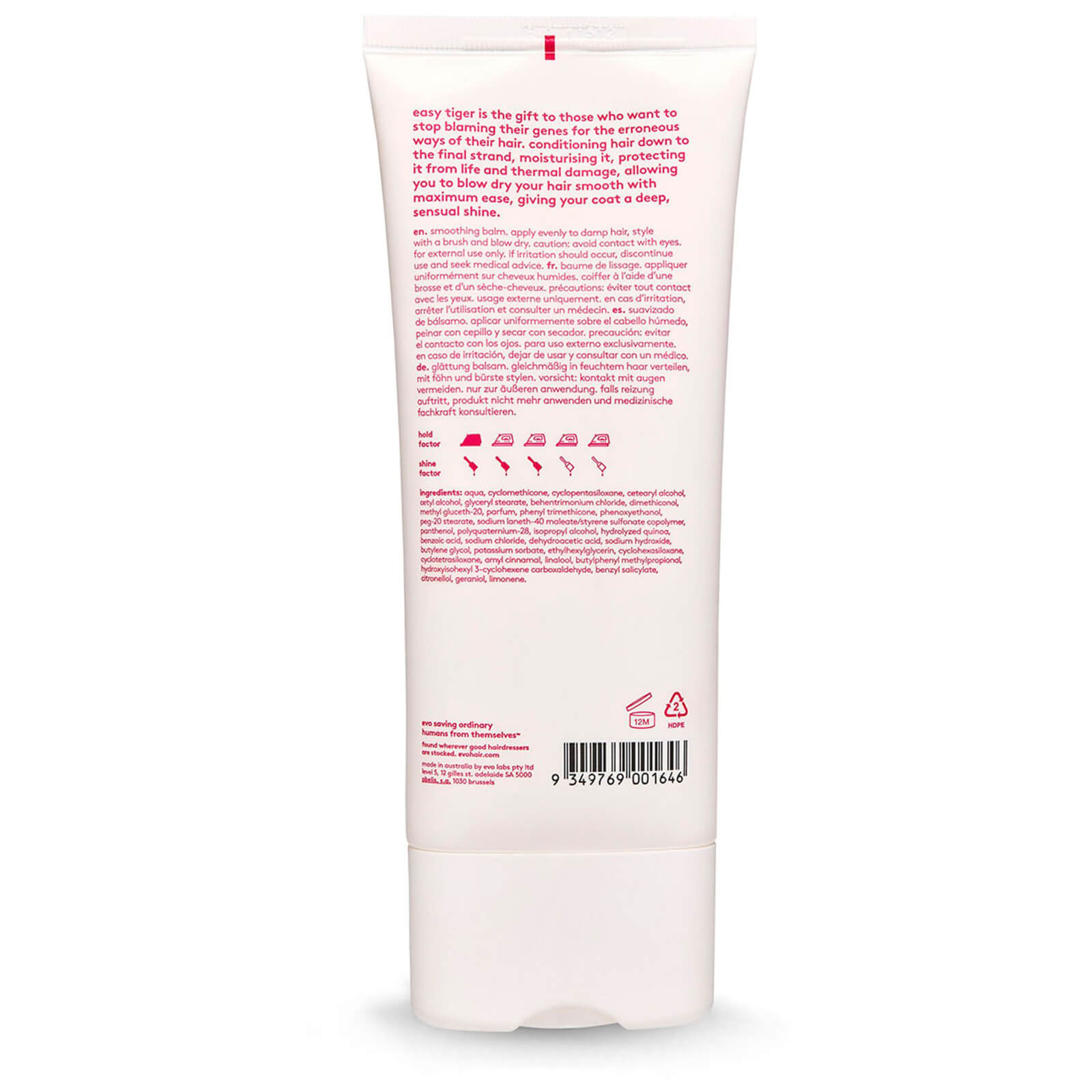 Evo easy tiger straightening balm provides thermal protection, moisturises, conditions and smoothes all hair types. Recommended for all hair types, especially thick, coarse hair.