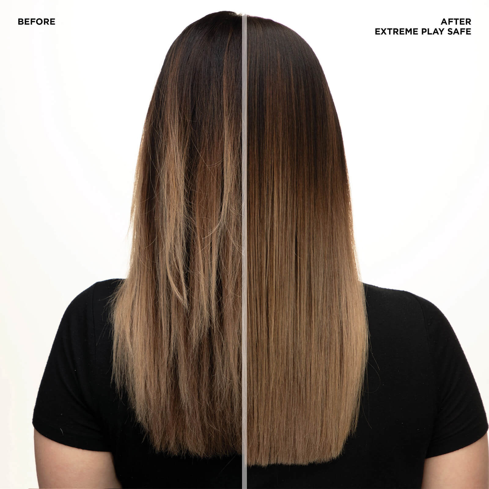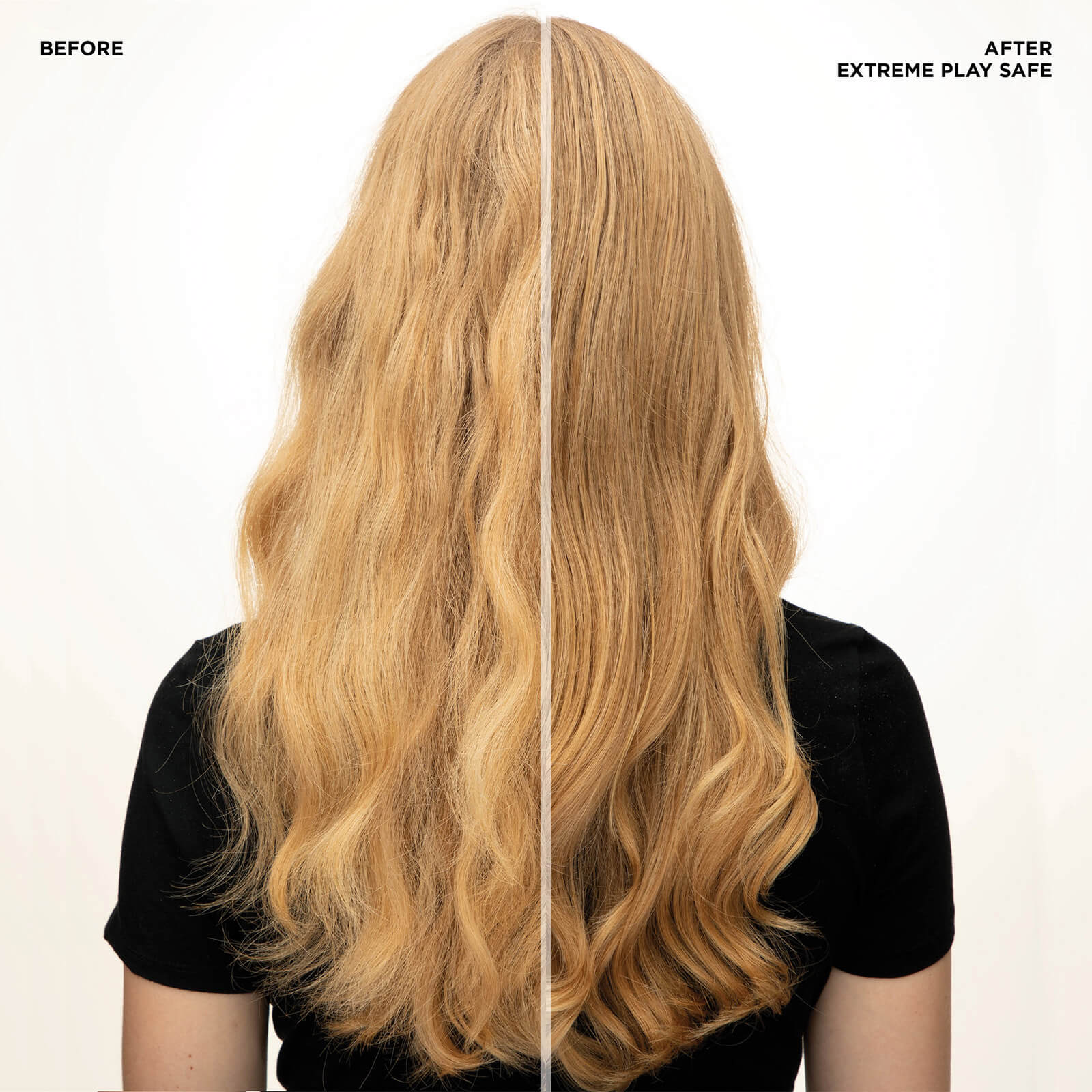 Redken's New Extreme Play Safe is a fortifying and heat protective 3-in-1 leave-in treatment for damaged hair. Formulated with plant protein and tourmaline, this innovative hair treatment reduces damage caused by hot tools, strengthens the hair fiber to reduce breakage, and protects hair from heat up to 450 degrees.