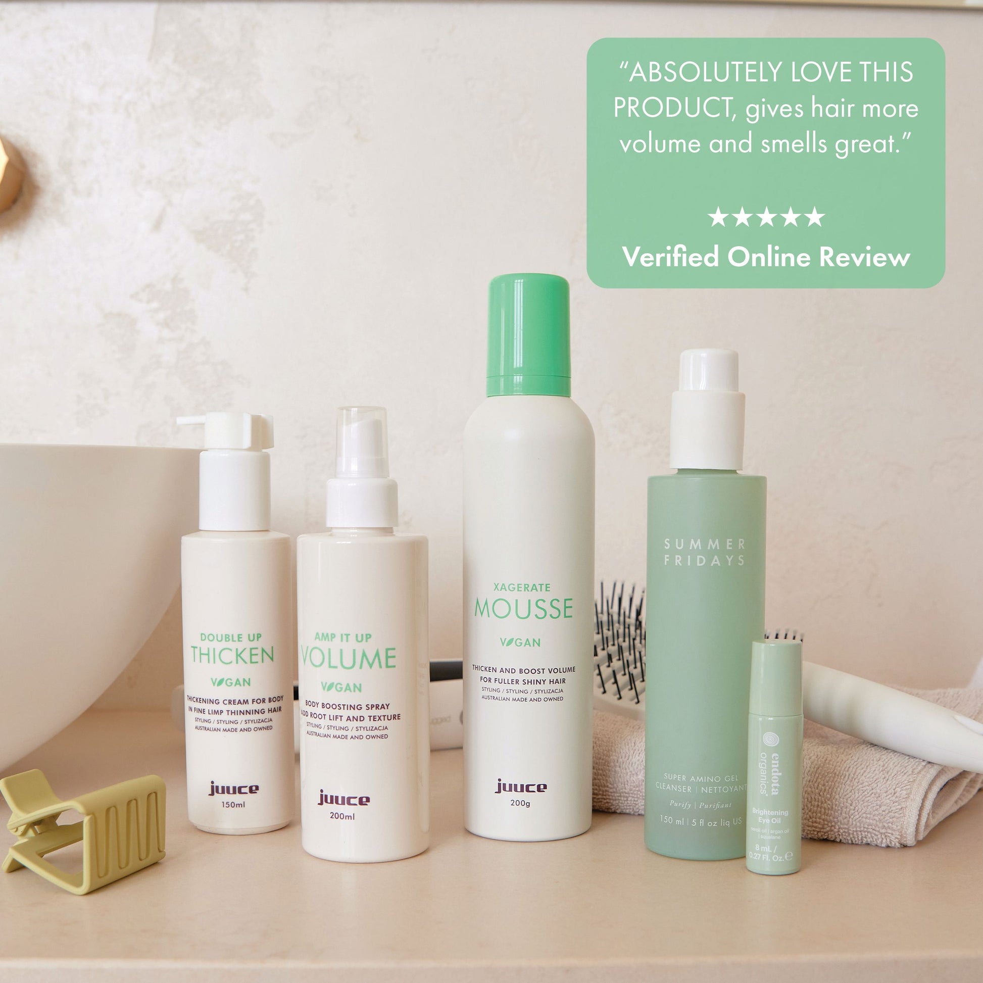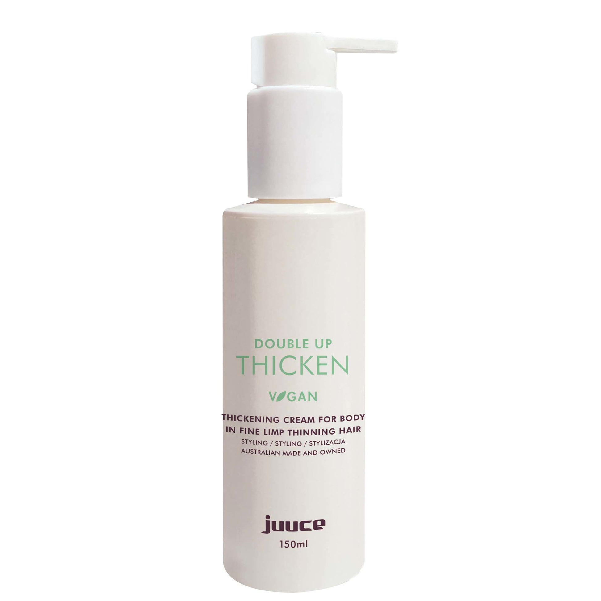 Juuce Double Up thickens fine, limp and thinning hair by adding volume and body while also strengthening and protecting.
