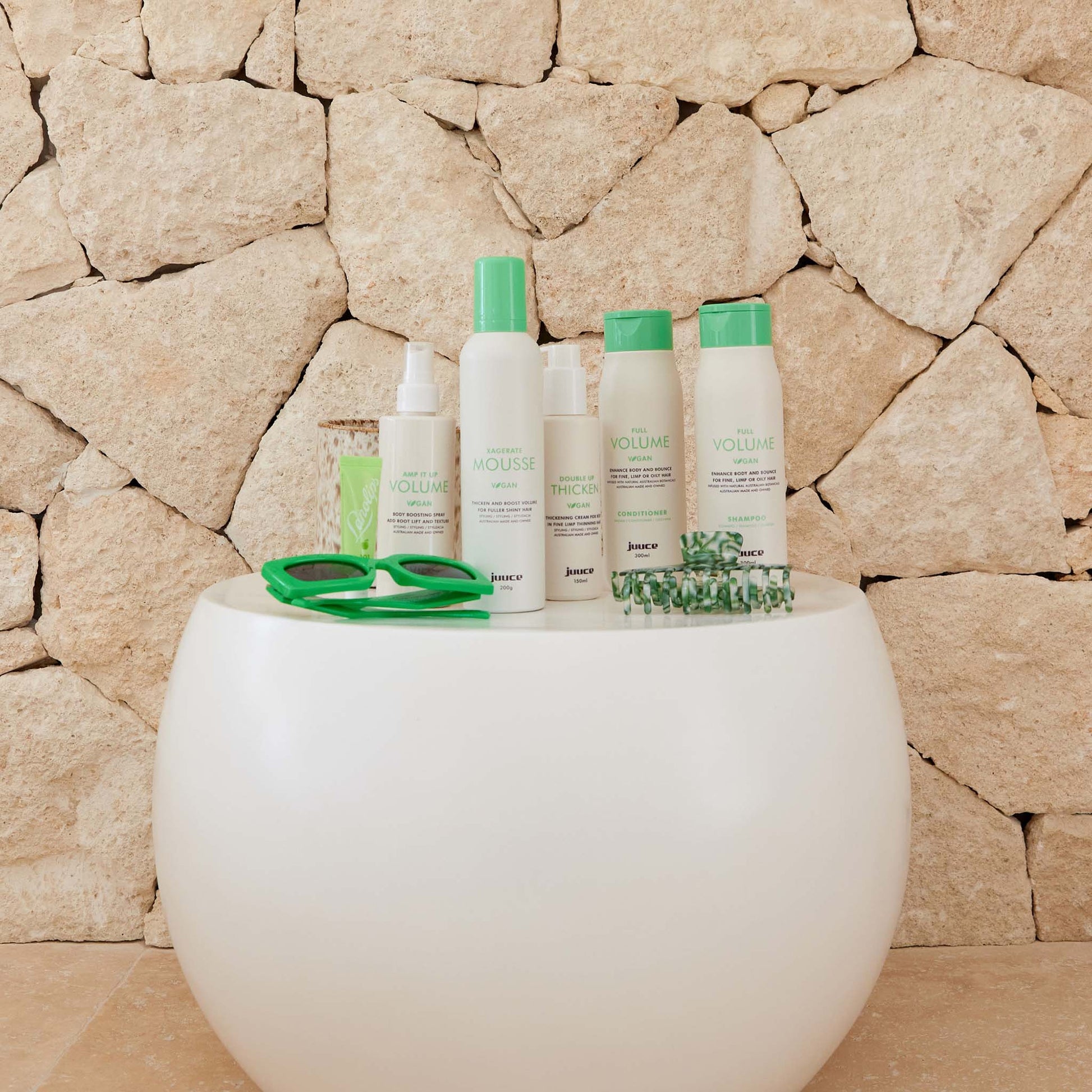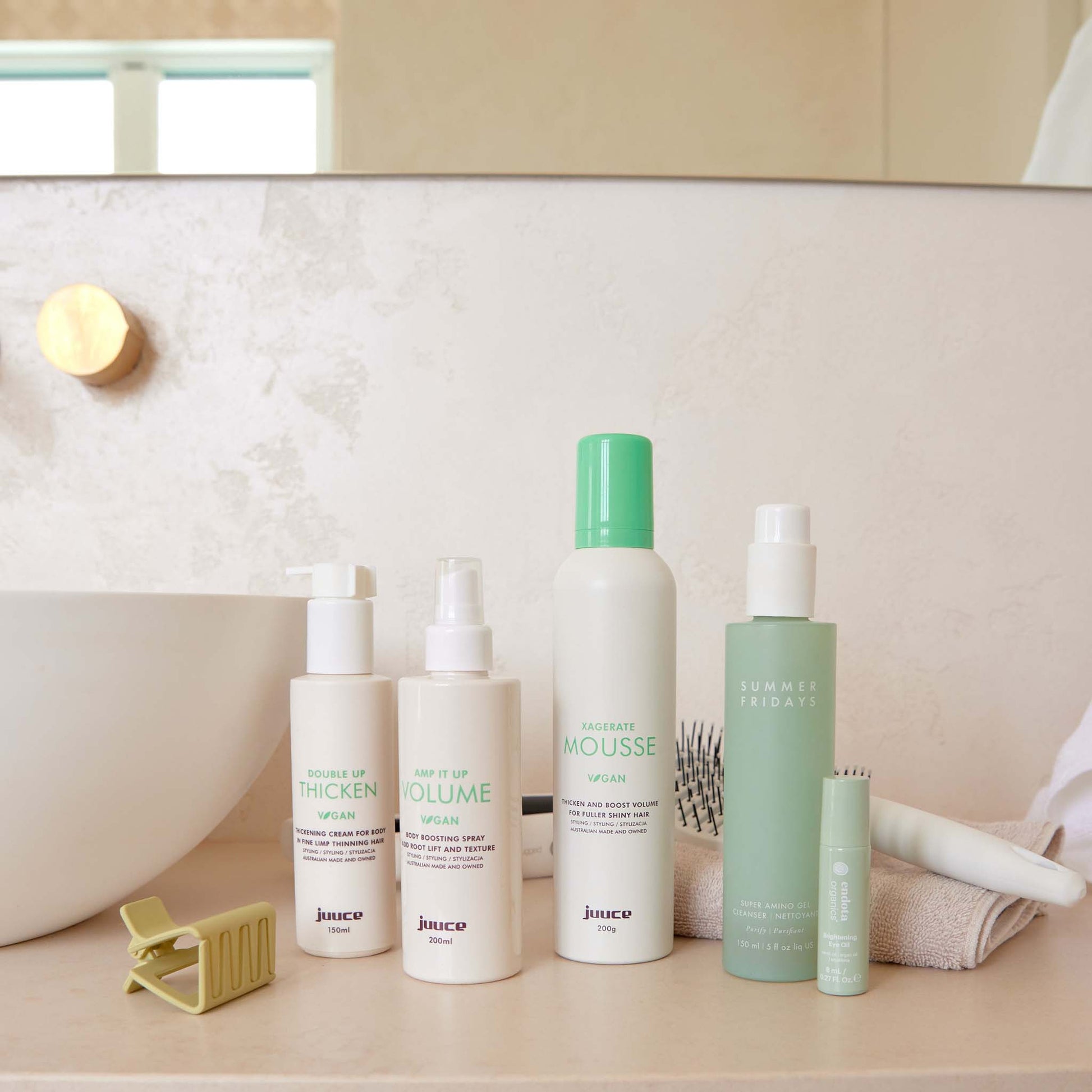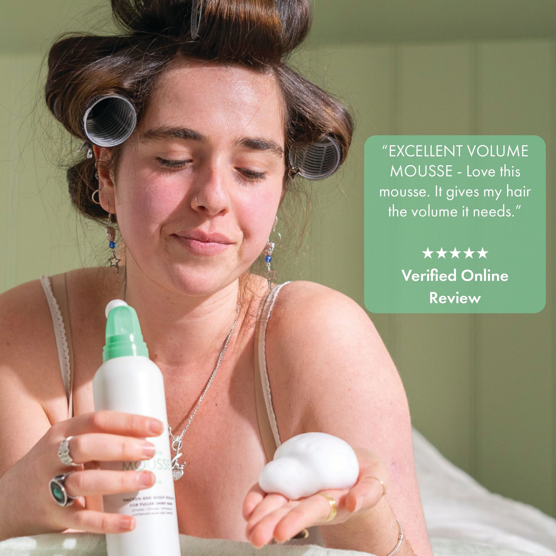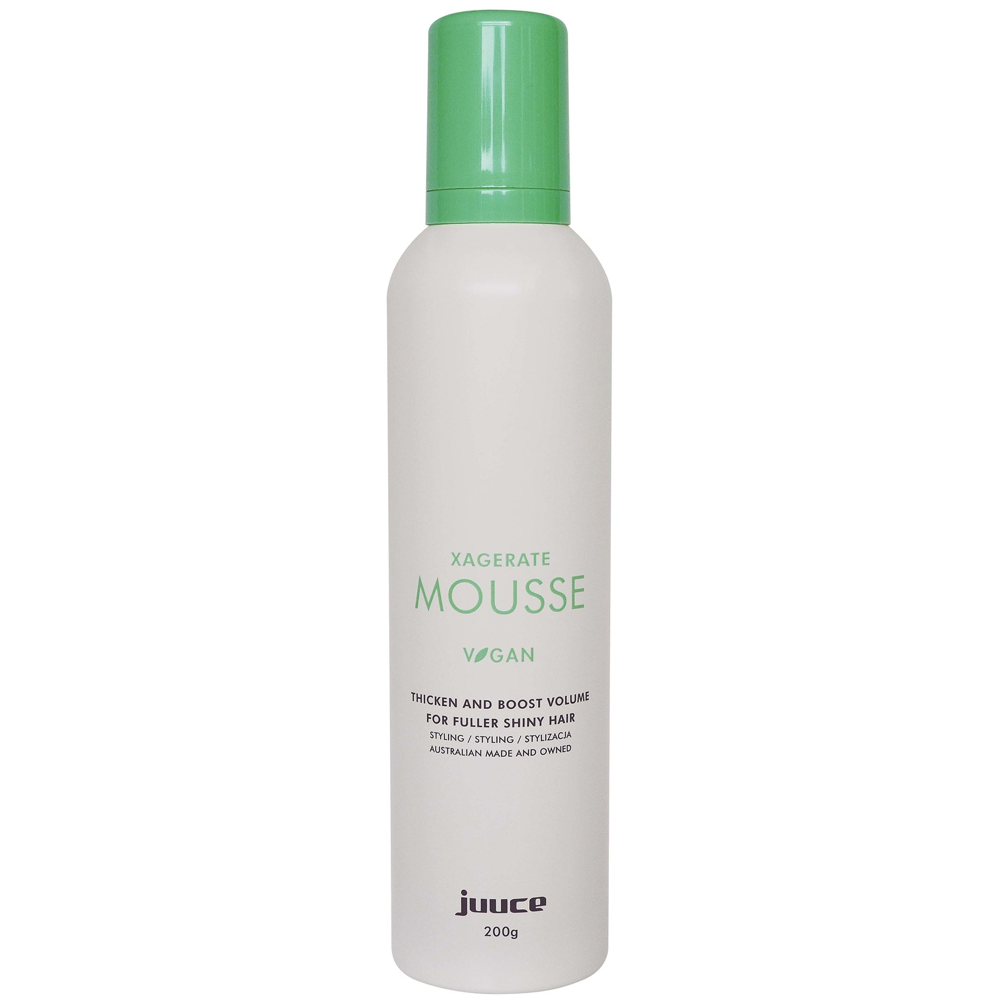 Juuce Xagerate Mousse increases body and bounce for fuller looking hair with thickening control.