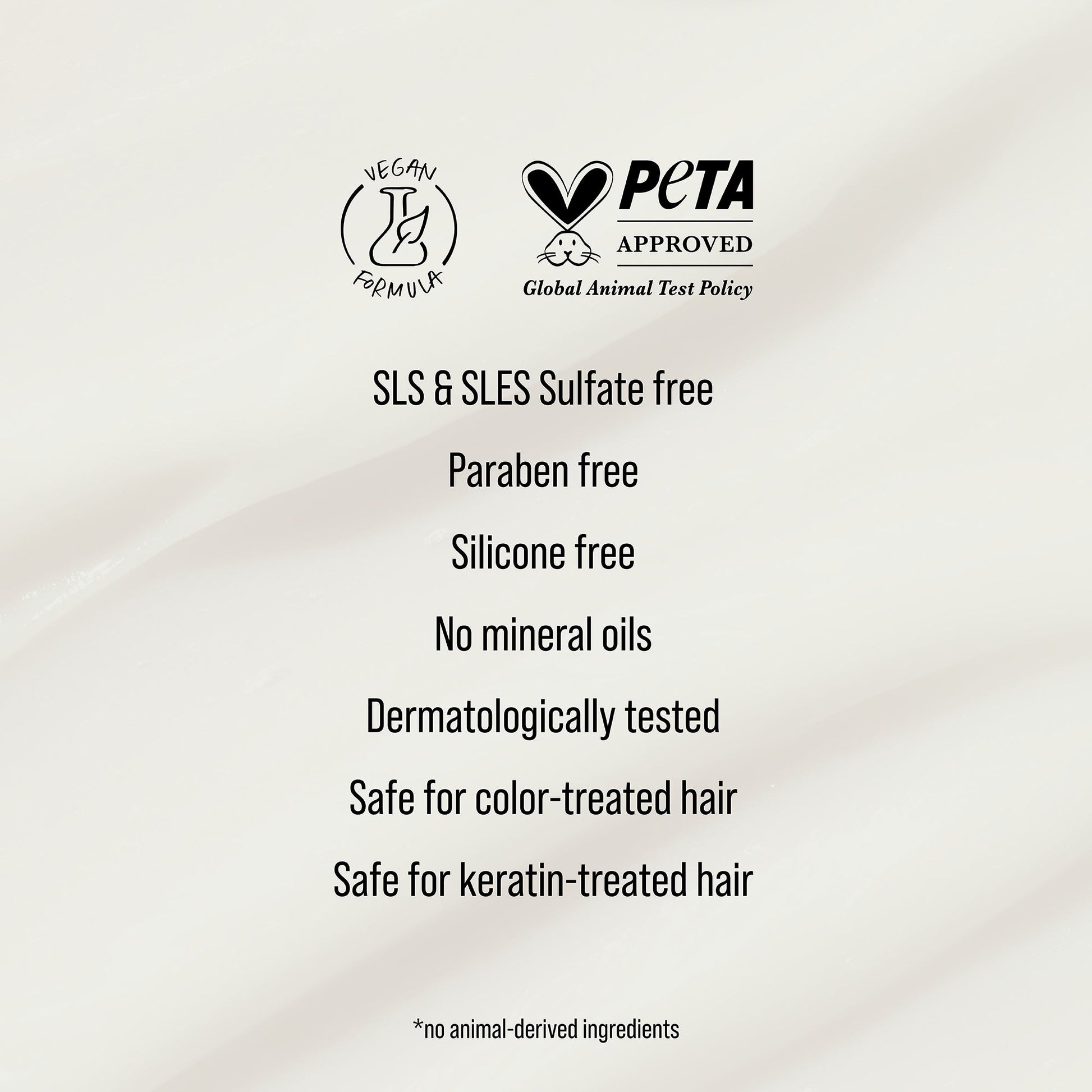- Formulated without SLS/SLES sulfates, salt (sodium chloride)*, parabens*, mineral oils, silicones, colorants or PEGs.