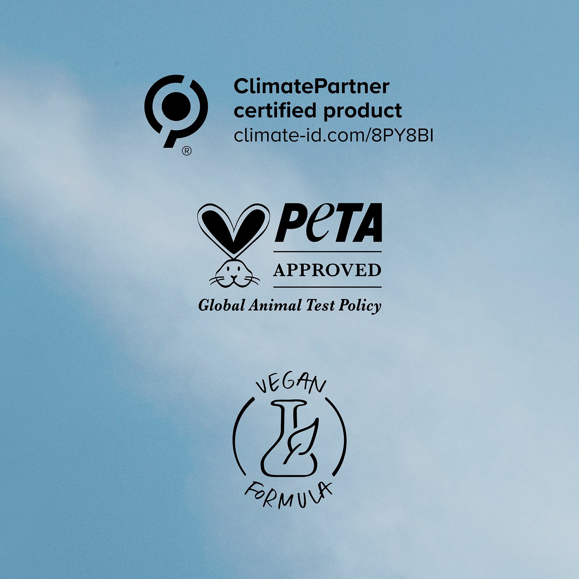 Our Commitment: Vegan formula (no animal-derived ingredients), PETA Approved, ClimatePartner Certified, CO₂ compensated