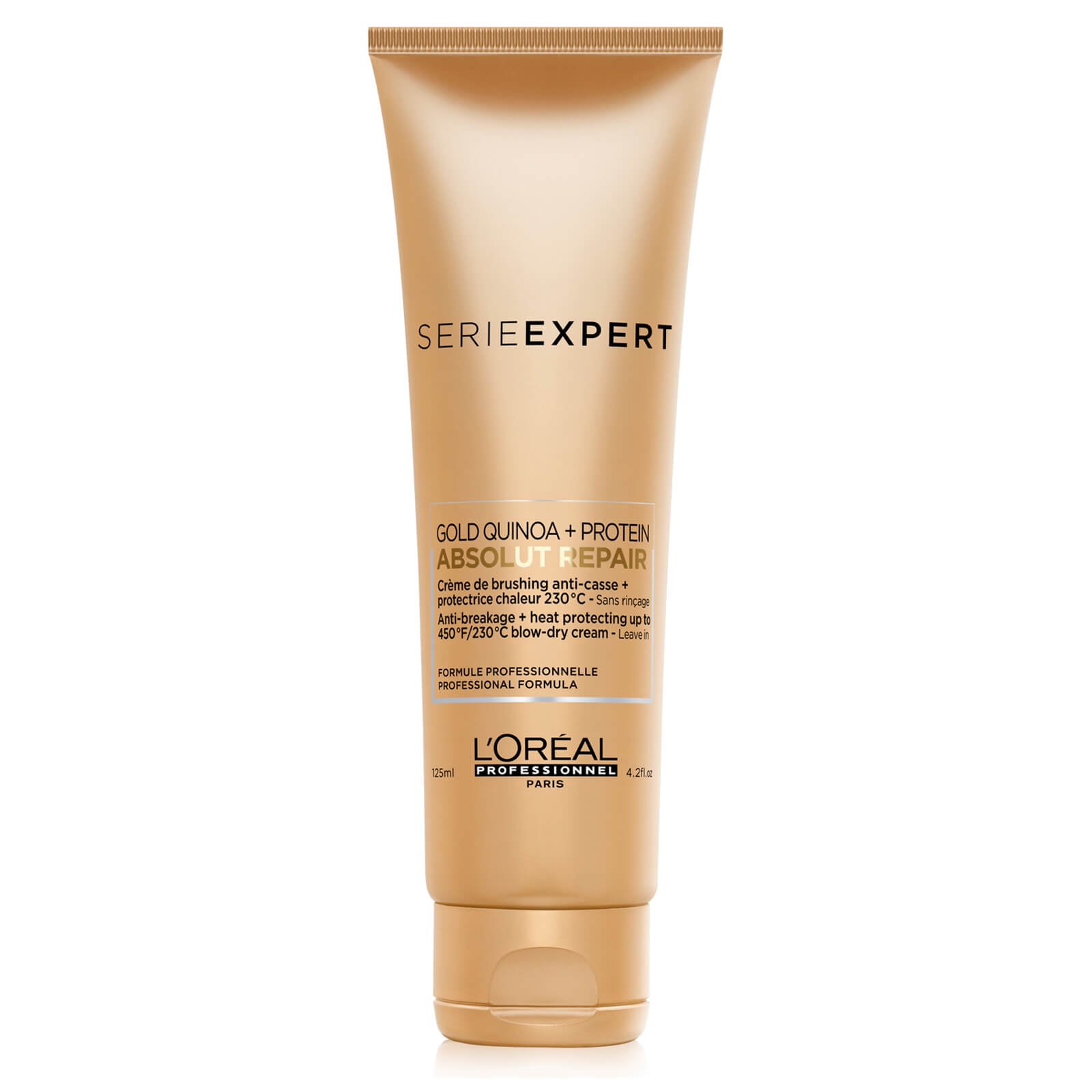 L'Oréal Professionnel Serie Expert Absolut Repair Gold Blowdry Cream 125ml is an anti-breakage and heat protecting (up to 230°C*) blow-dry cream for very damaged hair. Its formula is enriched with Gold Quinoa Bran extract and Wheat Protein.