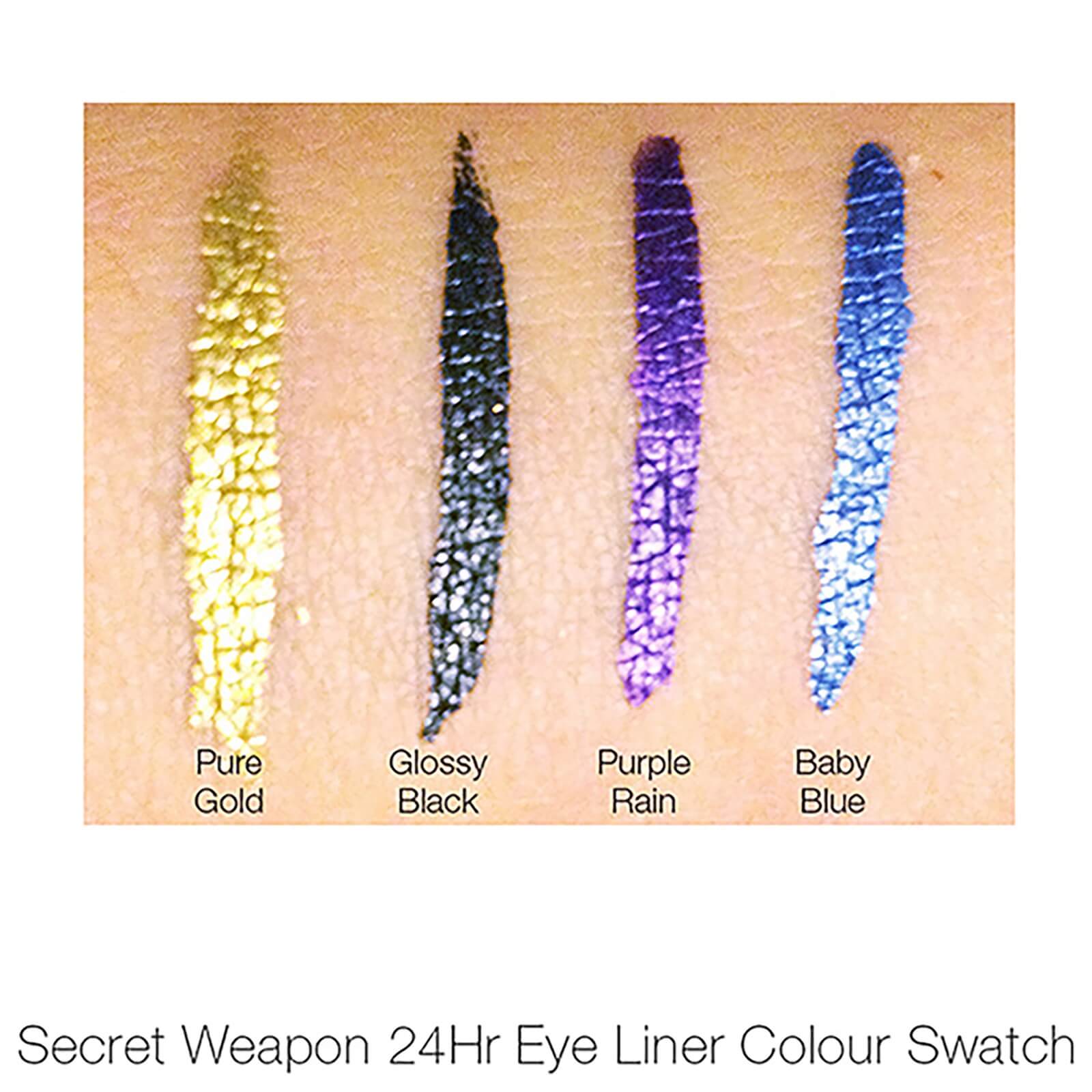 The kit contains four 24 Hour Peel off Liquid Eyeliner (4 x 1.5g) in the shades Glossy Black, Purple Rain, Baby Blue and Pure Gold.