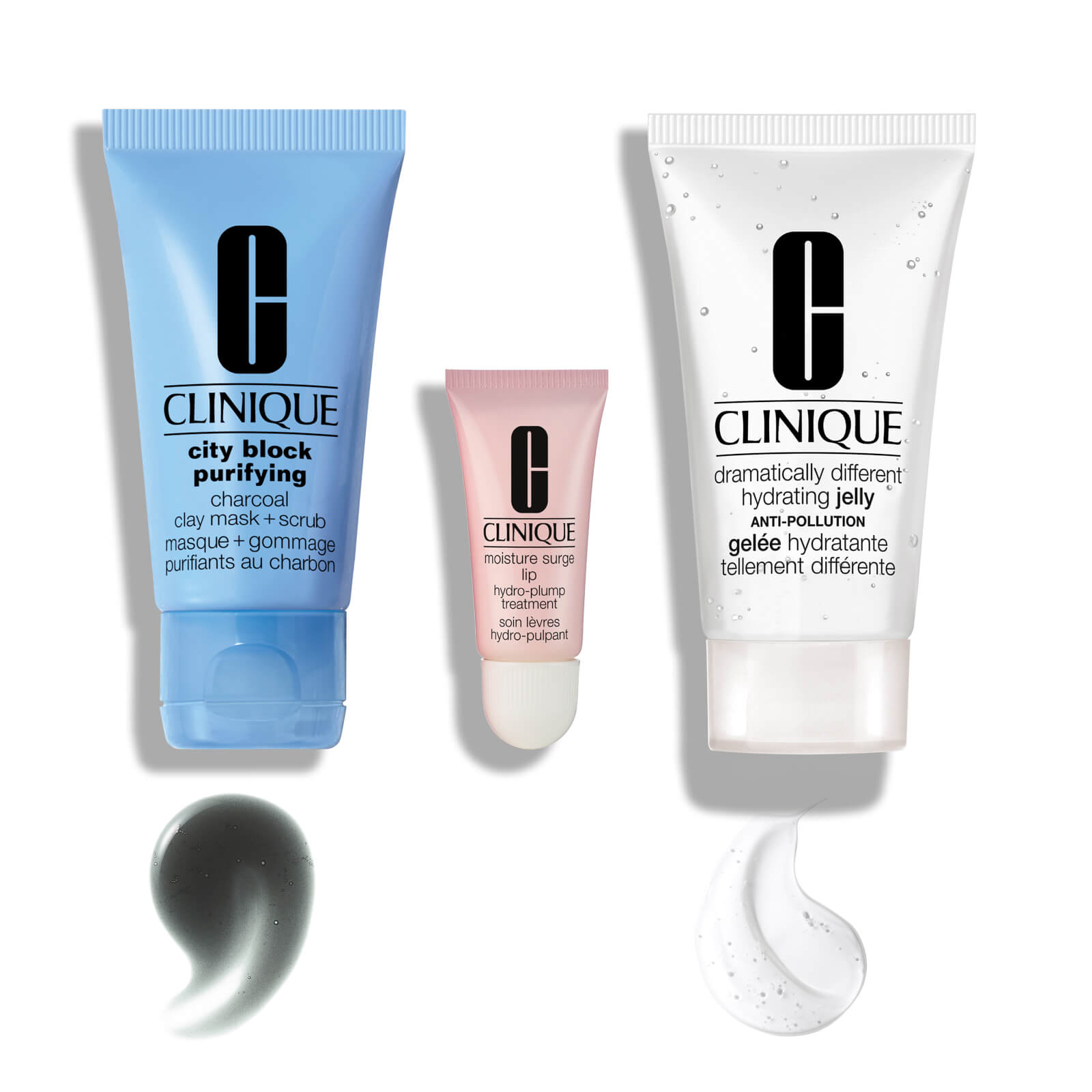 City life protection, three ways. Dramatically DifferentTM Hydrating Jelly delivers 24-hour hydration repair plus pollution protection. City Block PurifyingTM Charcoal Clay Mask + Scrub is a 5-minute dual-action detoxifying and exfoliating clay mask. Moisture SurgeTM Lip Hydro-Plump Treatment smooths, relieves dryness, and preps for soft, dewy lips.