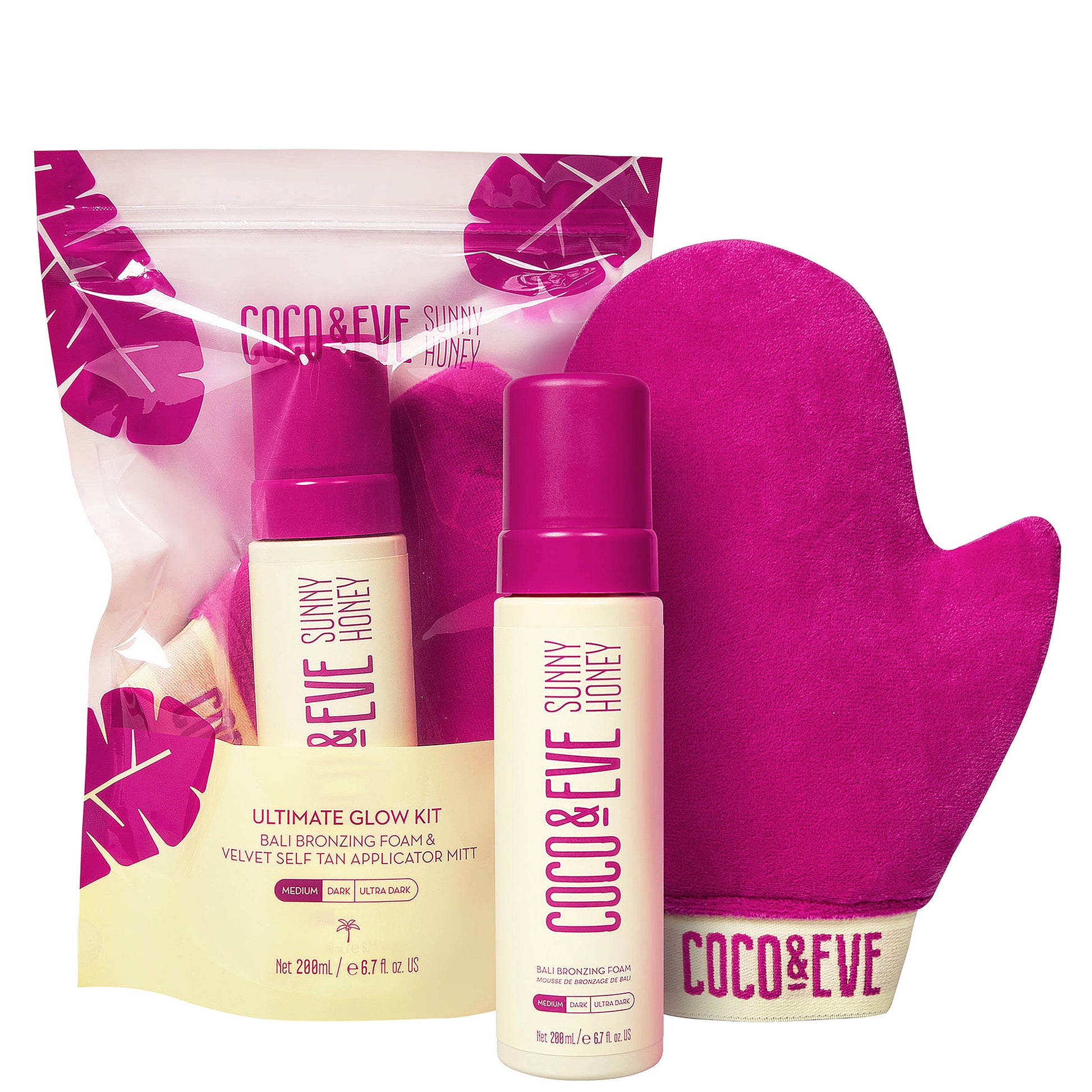 A two-piece self-tan set by Coco & Eve. The Ultimate Glow Kit in Medium features the brand’s best-selling Sunny Honey foam and an application accessory that allow you to achieve the perfect bronze base.
