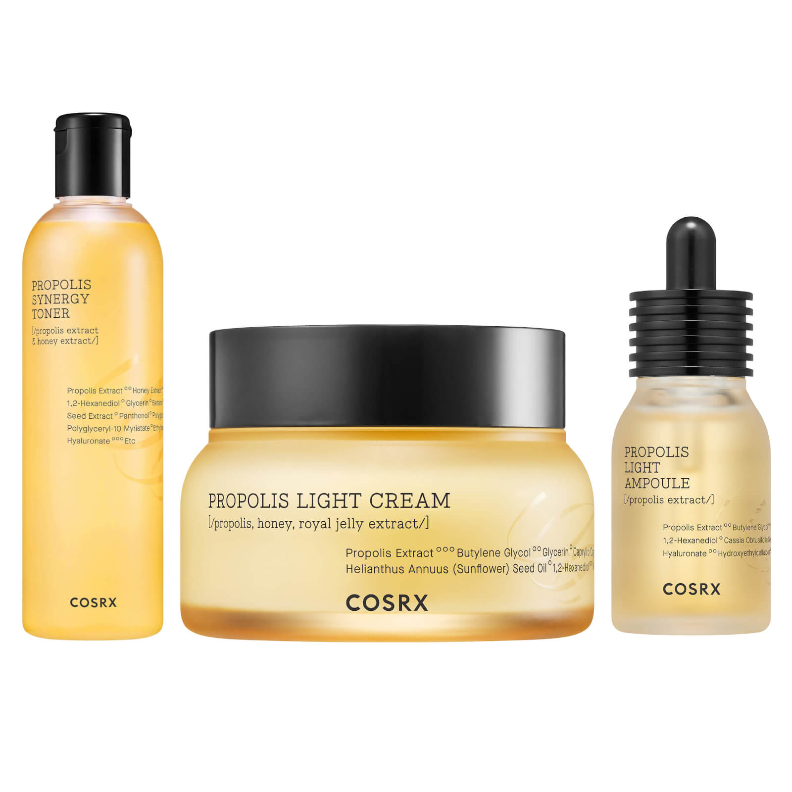 COSRX Full Fit Propolis range is formulated with Black Bee Propolis and honey extract, to nourish, plump, hydrate and give your skin a glowing complexion. These ingredients are known for their antibacterial, anti-inflammatory and skin repairing properties which makes the Propolis line suitable for those with acne-prone skin. The propolis line works by eliminating bacteria and stimulating skin repair which prevents scarring and formation of blemishes.