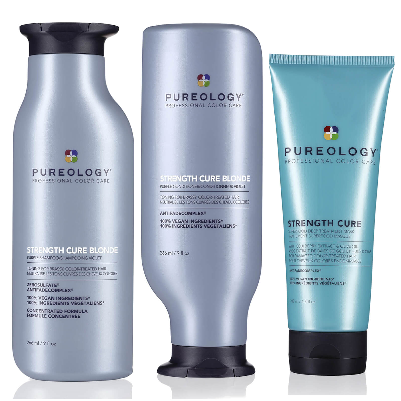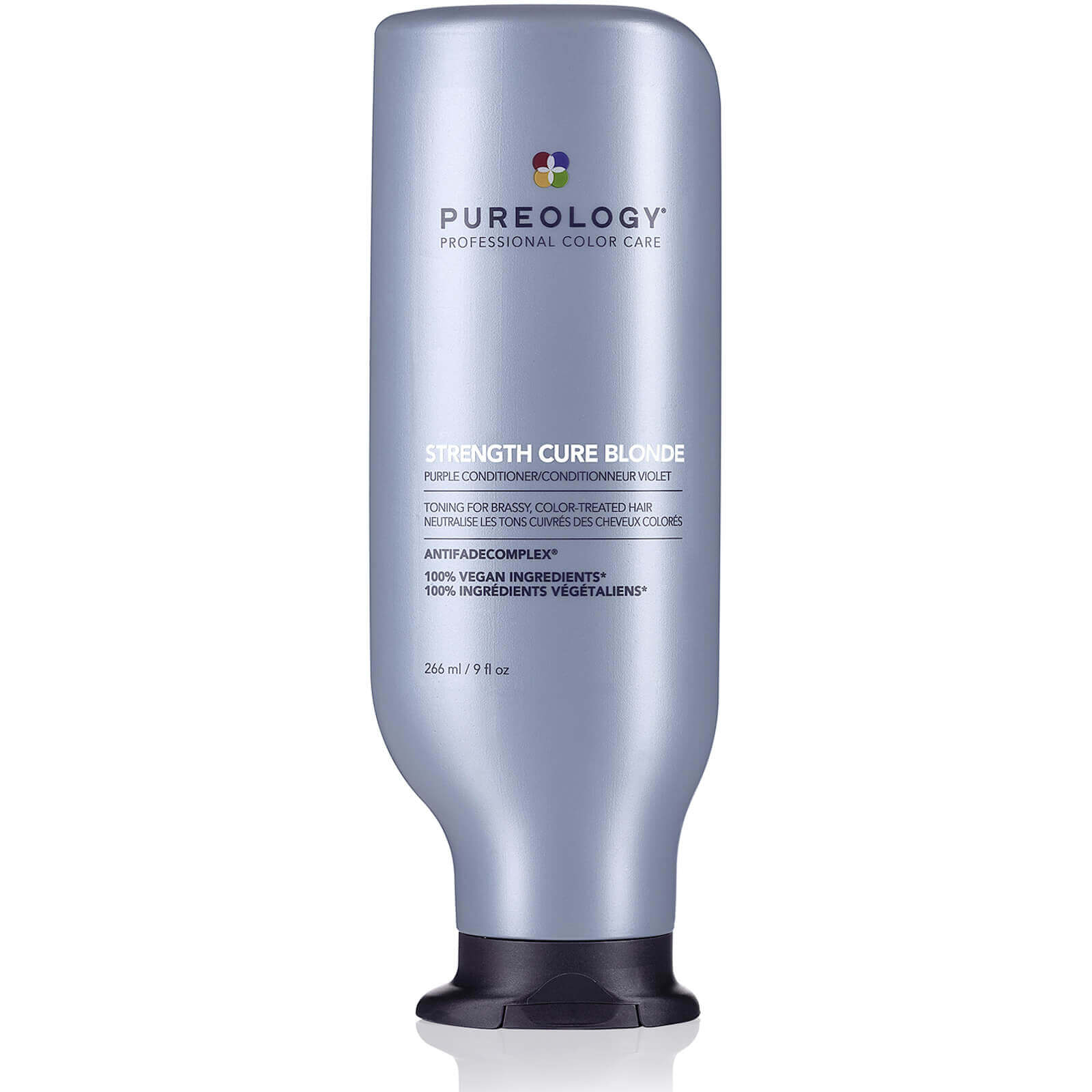 Pureology Strength Cure Blonde Shampoo and Conditioner tones and fortifies brassy, damaged and lightened hair with key ingredients Keravis, Astaxanthin, and Purple Orchid toning pigments and a signature aromatherapy blend of Pear, Rose, and Sandalwood.