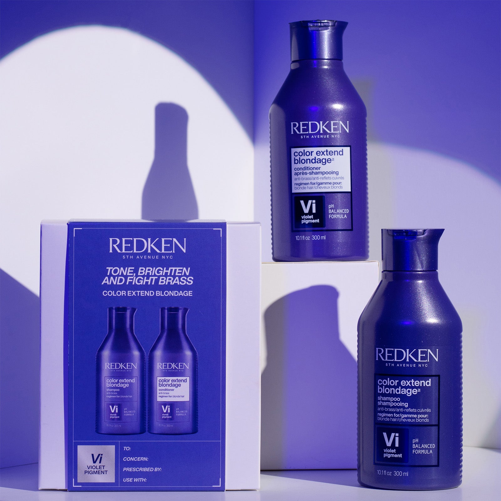 Redken Color Extend Blondage is a color-depositing purple shampoo for blonde and highlighted hair. This shampoo features key ingredients salicylic acid to strengthen and repair blonde hair from the core and pure violet (purple) pigments to remove unwanted brassiness and leave blonde hair color cool and bright. This formula gently cleanses and adds softness.