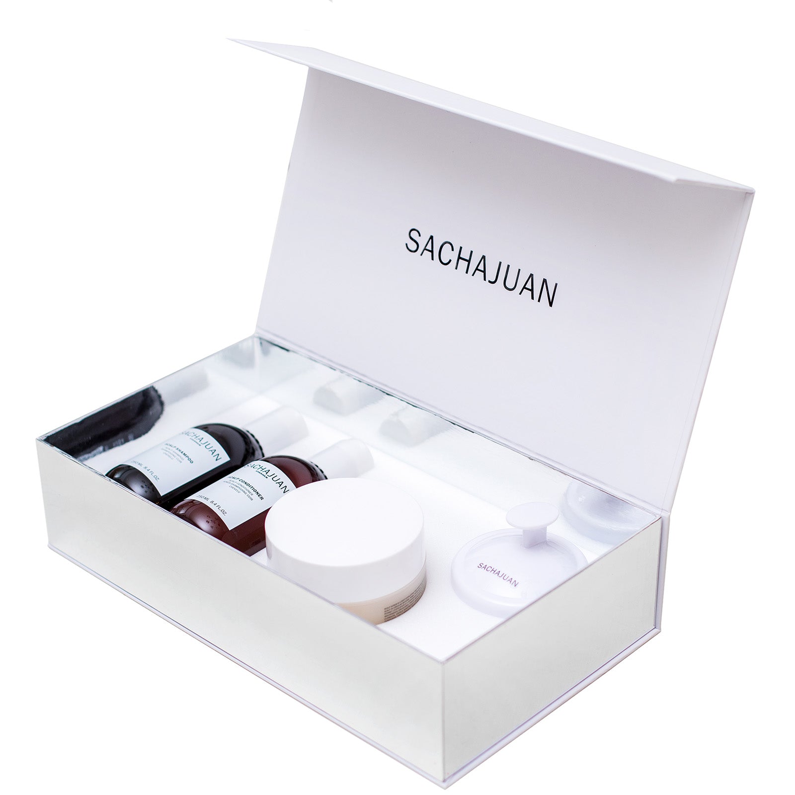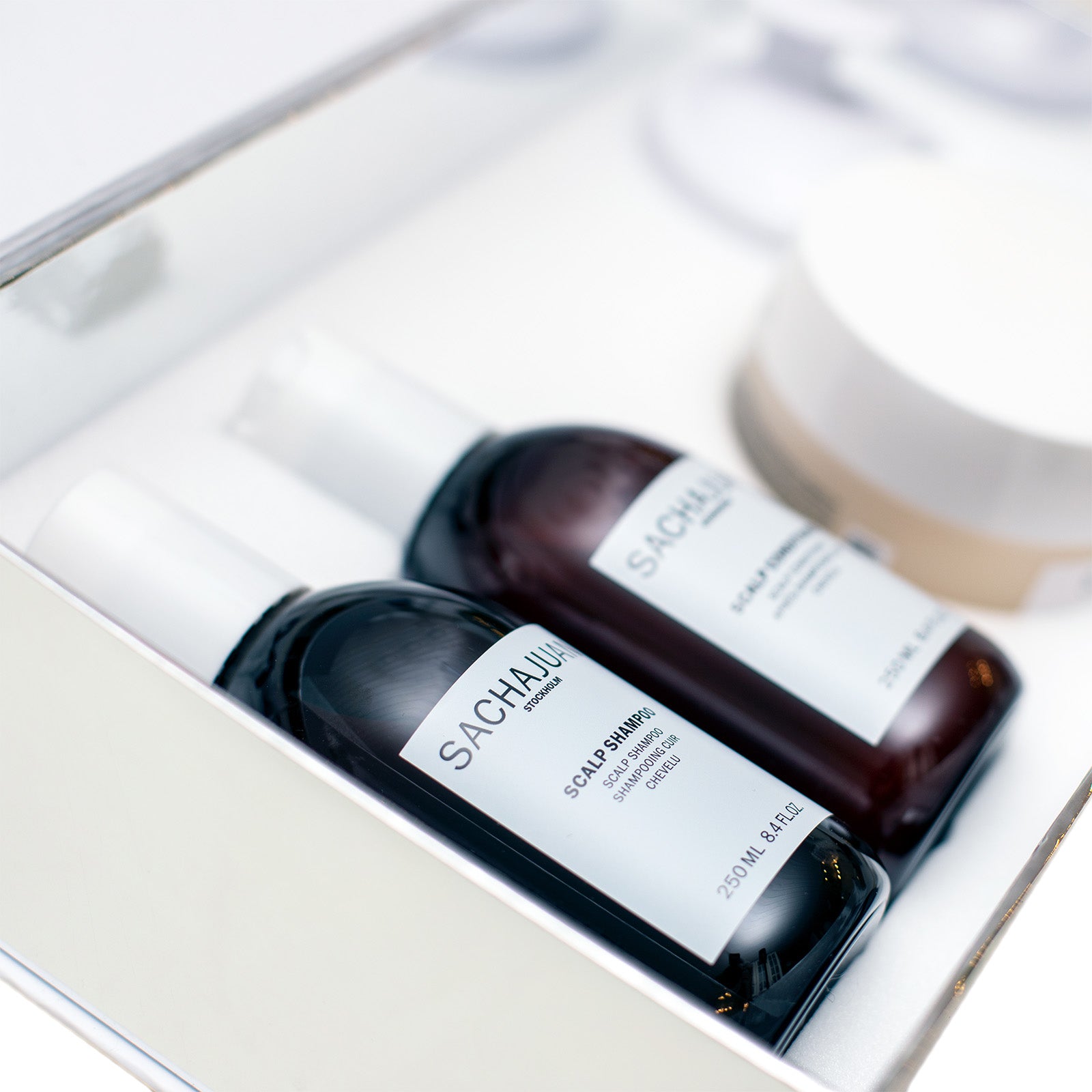 A beautifully packaged gift box containing SACHAJUAN's award-winning Scalp Shampoo, Conditioner, Scalp Scrub and Scalp Brush. Enriched with Ocean Silk Technology to maintain moisture balance of the hair and scalp, while Piroctone Olamine and Climbazole remove dry dandruff and soothe any scalp irritations. The shampoo and conditioner can be used daily to maintain a healthy scalp whilst the purifying scalp scrub can be used weekly to gently exfoliate and remove dry dandruff. Nurturing Shea butter and Soybean Oils have emolliating properties, helping to lock in moisture within the scalp and hair without any greasiness. This is the perfect set for those wishing to treat any underlying scalp issues or simply maintain good scalp health.