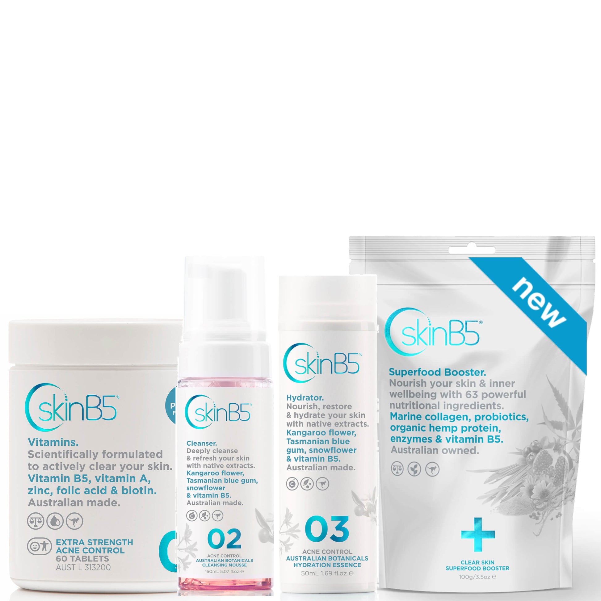 Australian madeSkinB5's NEW Superfood for clearer skin. Your body responds to the goodness you put into it and so does your skin. With the power of 63 nutritional ingredients, our uniquely formulated Superfood Booster is the all-natural supplement your skin will thank you for.