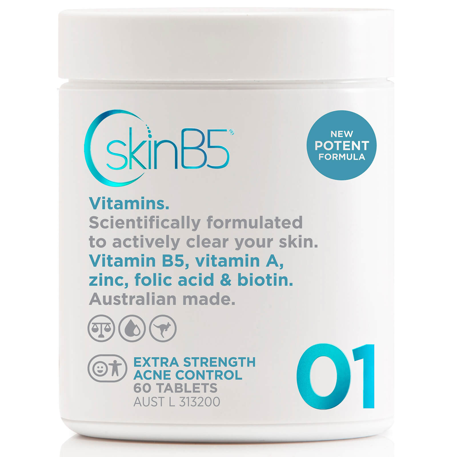 Extra Strength Acne Control Vitamins use a next generation approach to skin wellness. Harnessing the healing power of Vitamin B5, Zinc, Copper and Vitamin A to actively promote a clear complexion. SkinB5's revolutionary treatment assists with sebum control and cell renewal, builds immune defence, promotes internal harmony and alleviates stress.