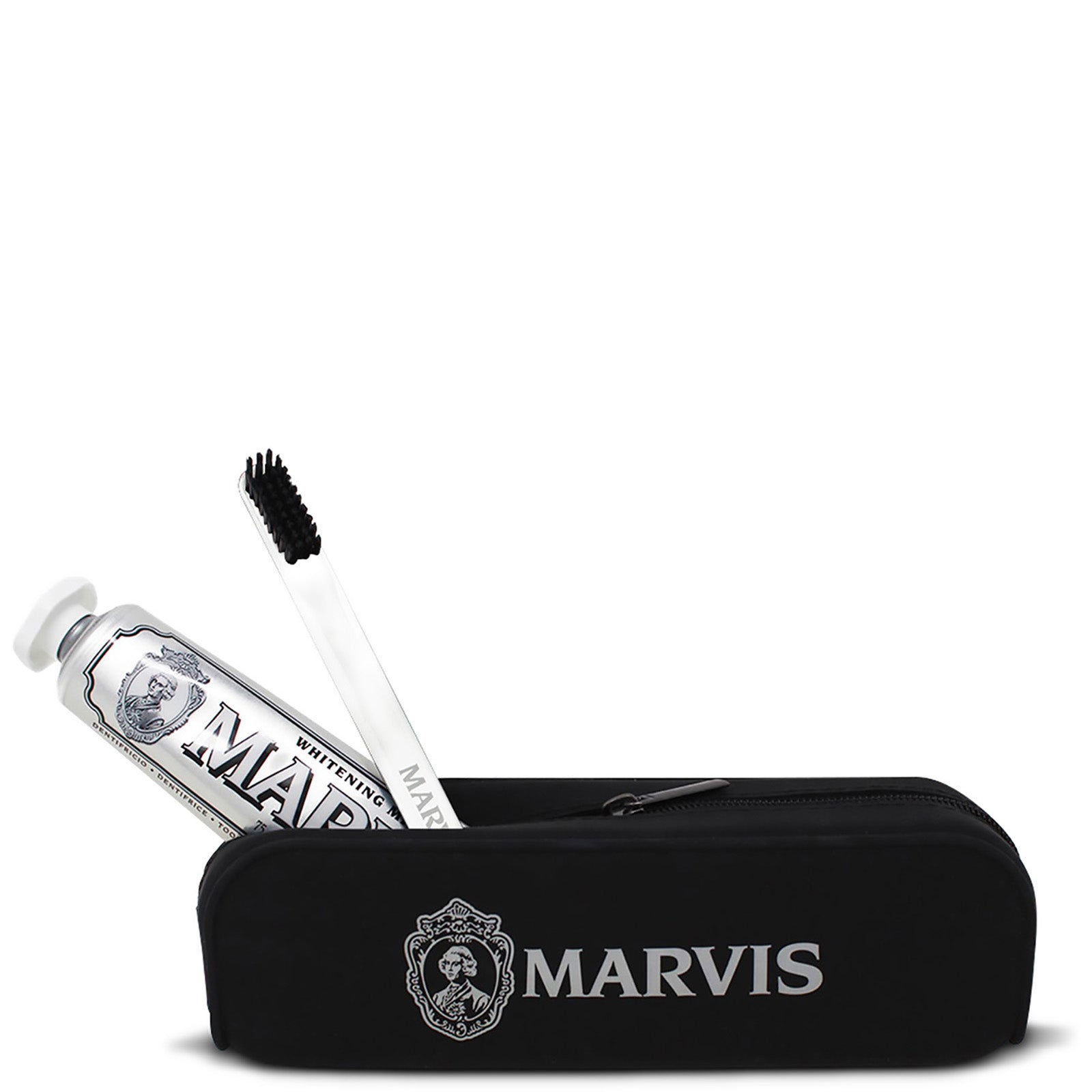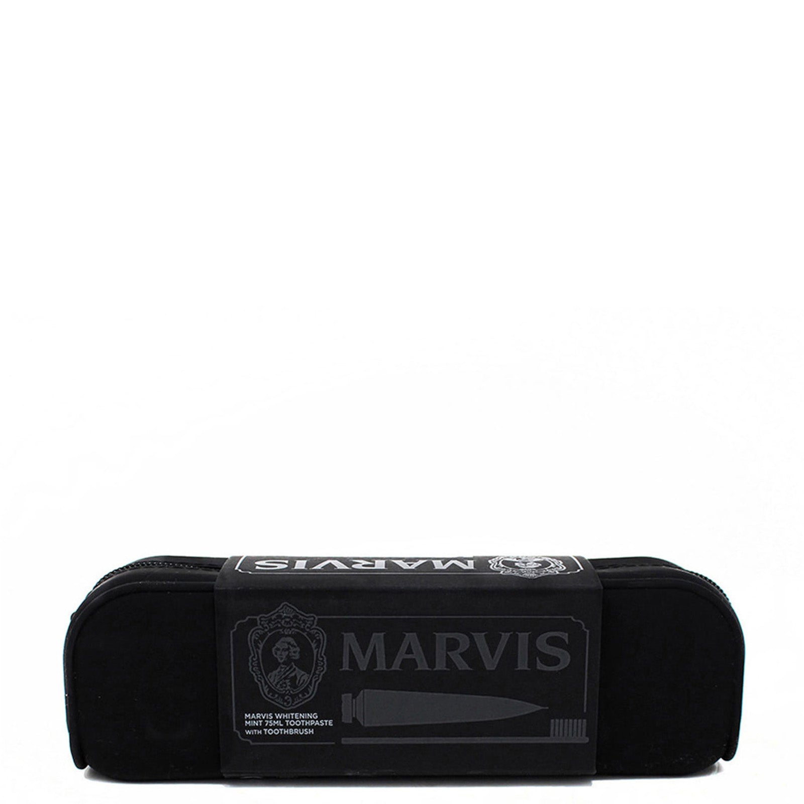 Marvis has made it even easier to maintain your oral health with the elegant beauty bag travel set. Enjoy two different sizes of Marvis toothpaste, along with a soft toothbrush, delivered in a high -quality black silicone bag.