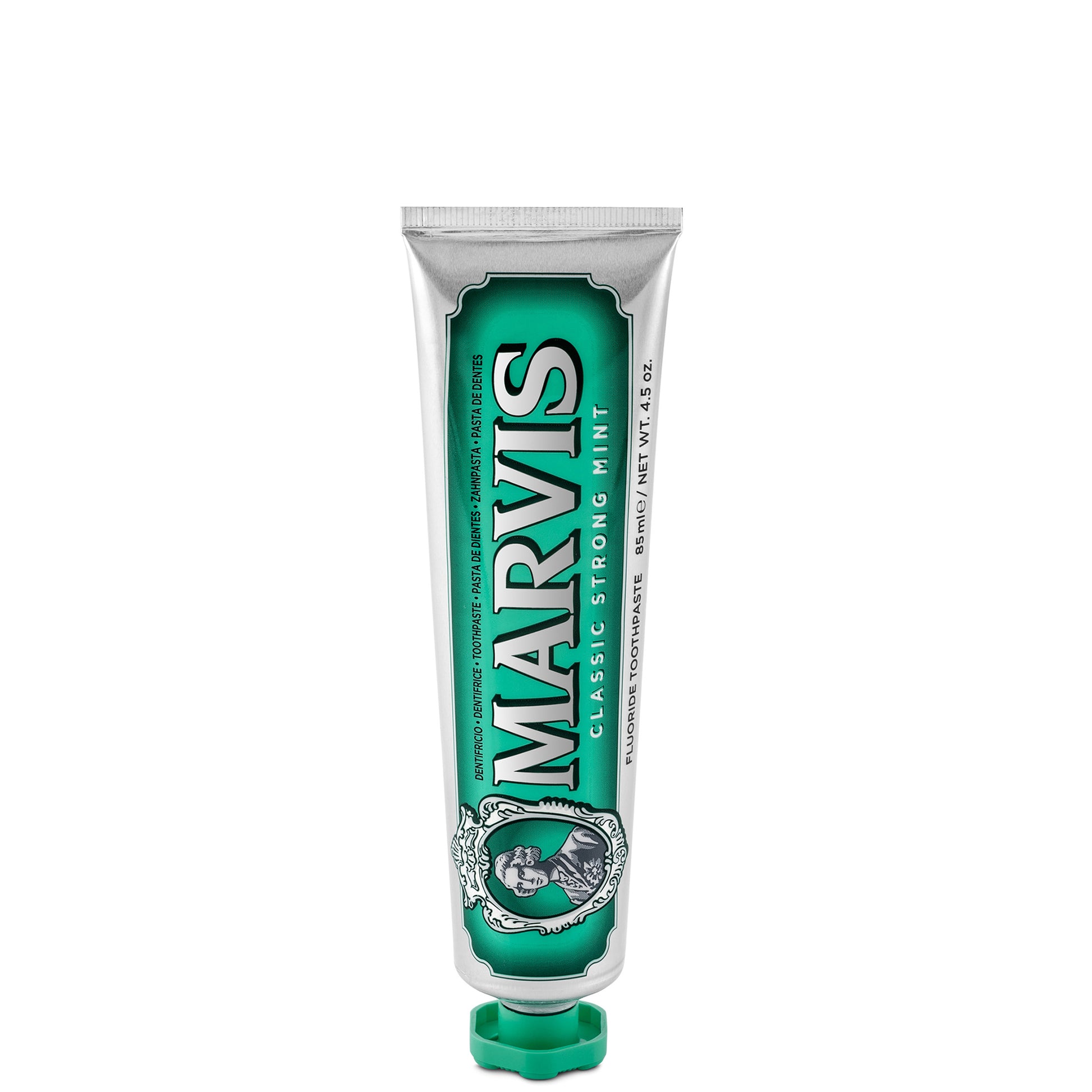 Transform your smile and teeth-cleaning ritual with the Classic Strong Mint Toothpaste from luxury Italian toothpaste brand Marvis; a refreshing, creamy toothpaste in cooling mint flavour that whitens and protect teeth while freshening breath. Developed to keep teeth and gums healthy whilst preventing decay, the toothpaste utilises gentle a xylitol and sorbitan-based formula to cleanse and condition the teeth without irritation. Experience luxurious and contemporary oral hygiene.
