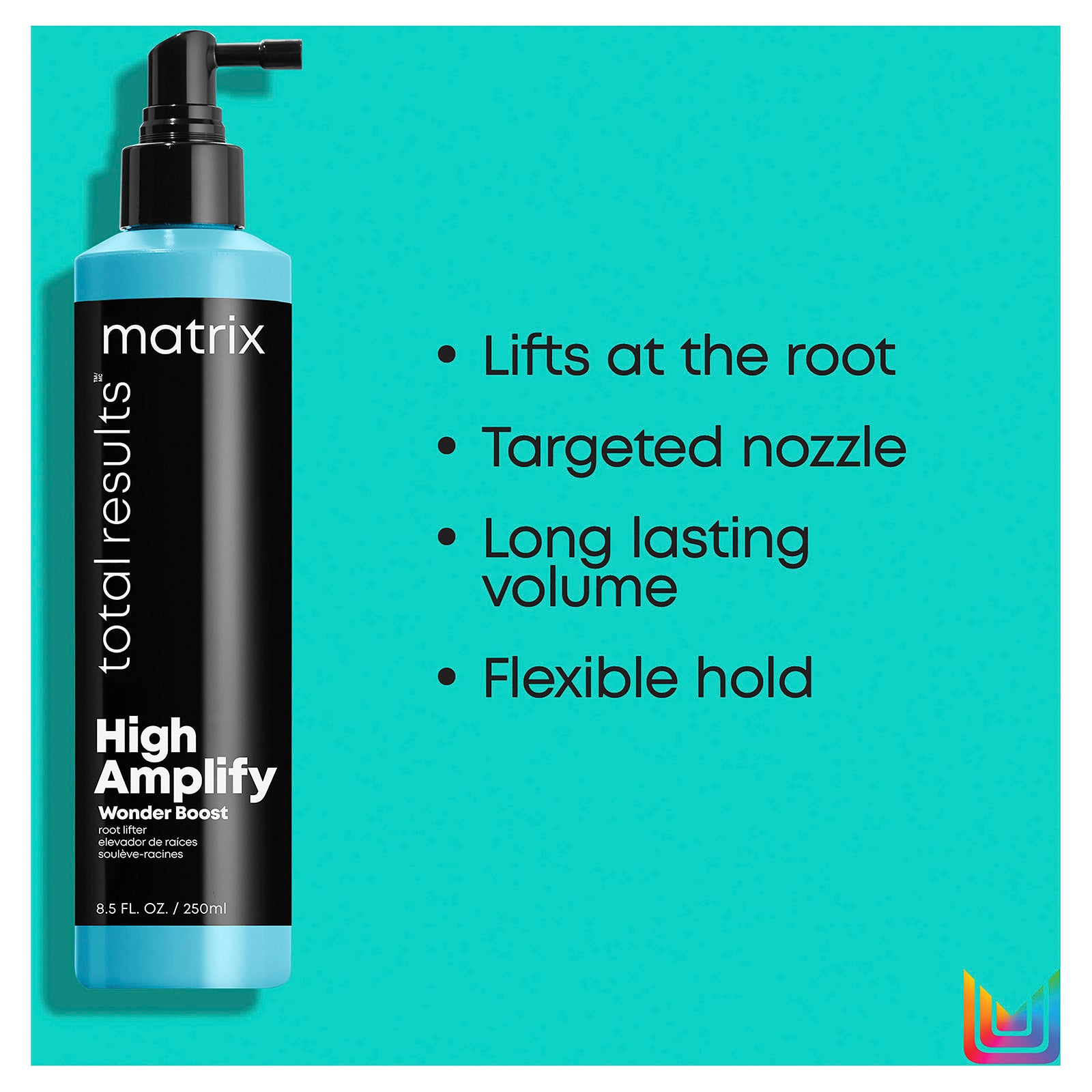 Turn up the volume on flat hair with Matrix Total Results High Amplify Wonder Boost Root Lifter! This silicone free styling spray uses protein to boost the structure of fine, limp hair for lightweight body with a soft, flexible hold. The targeted applicator makes it easy to achieve extreme root lift or gorgeous, all over body. Experience up to a 35% boost of volume when used with Matrix High Amplify Shampoo and Conditioner.