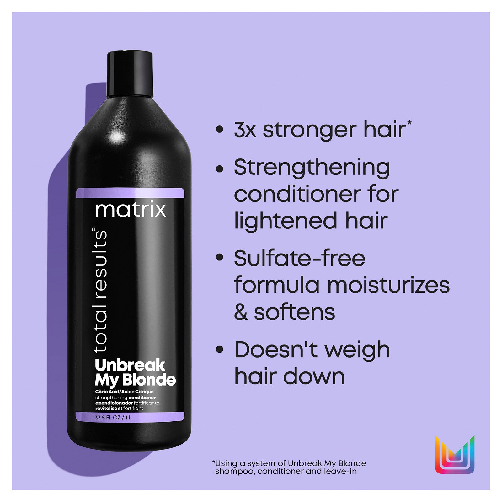 Matrix Total Results Unbreak My Blonde Conditioner is infused with citric acid to reinforce weakened bonds, nourishes and softens without weighing hair down.
