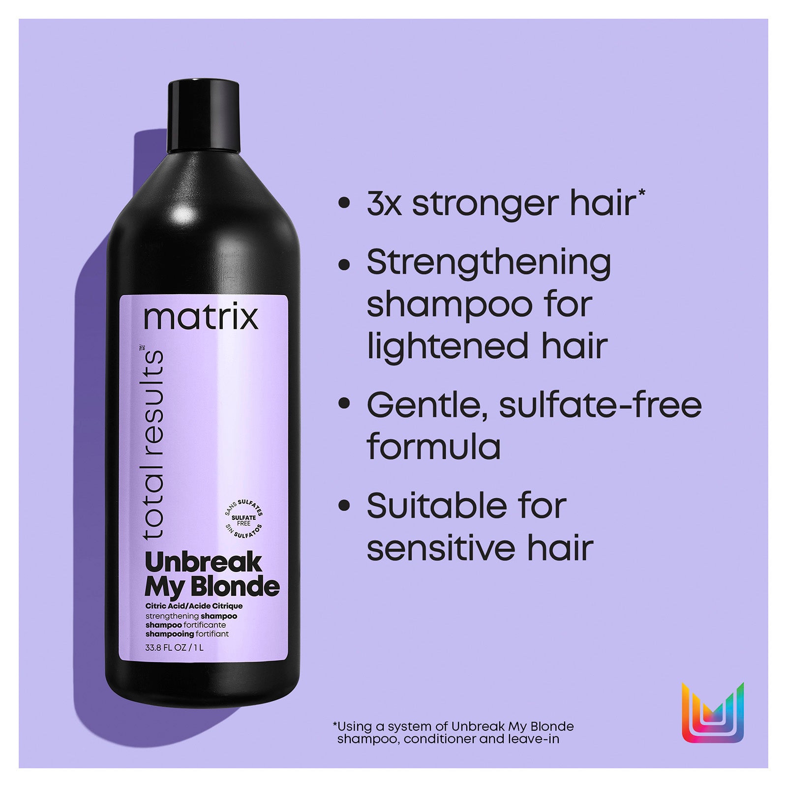 Matrix Total Results Unbreak My Blonde Shampoo is infused with citric acid to gently cleanse sensitive hair. Revives damaged and over-processed hair, leaving hair soft, shiny and 3x stronger!