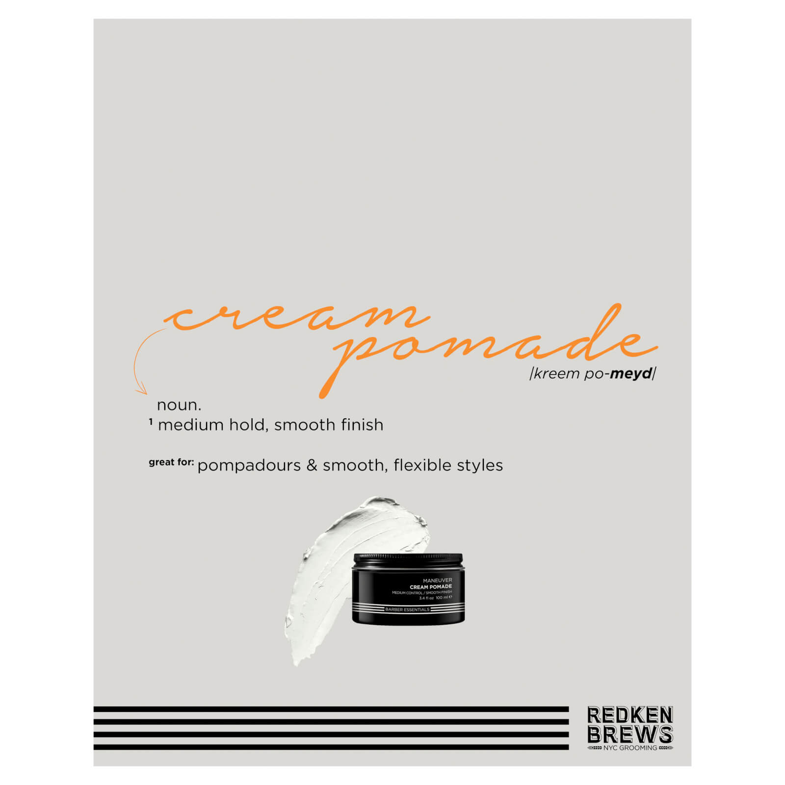 Smooth and control your hair with Redken Brews Men's Maneuver Cream Pomade; a water-based formula that offers medium hold without stiffness or sticky residue. The lightweight, easy-to-use pomade shapes and defines hair with flexible movement and a low shine, professionally styled finish.